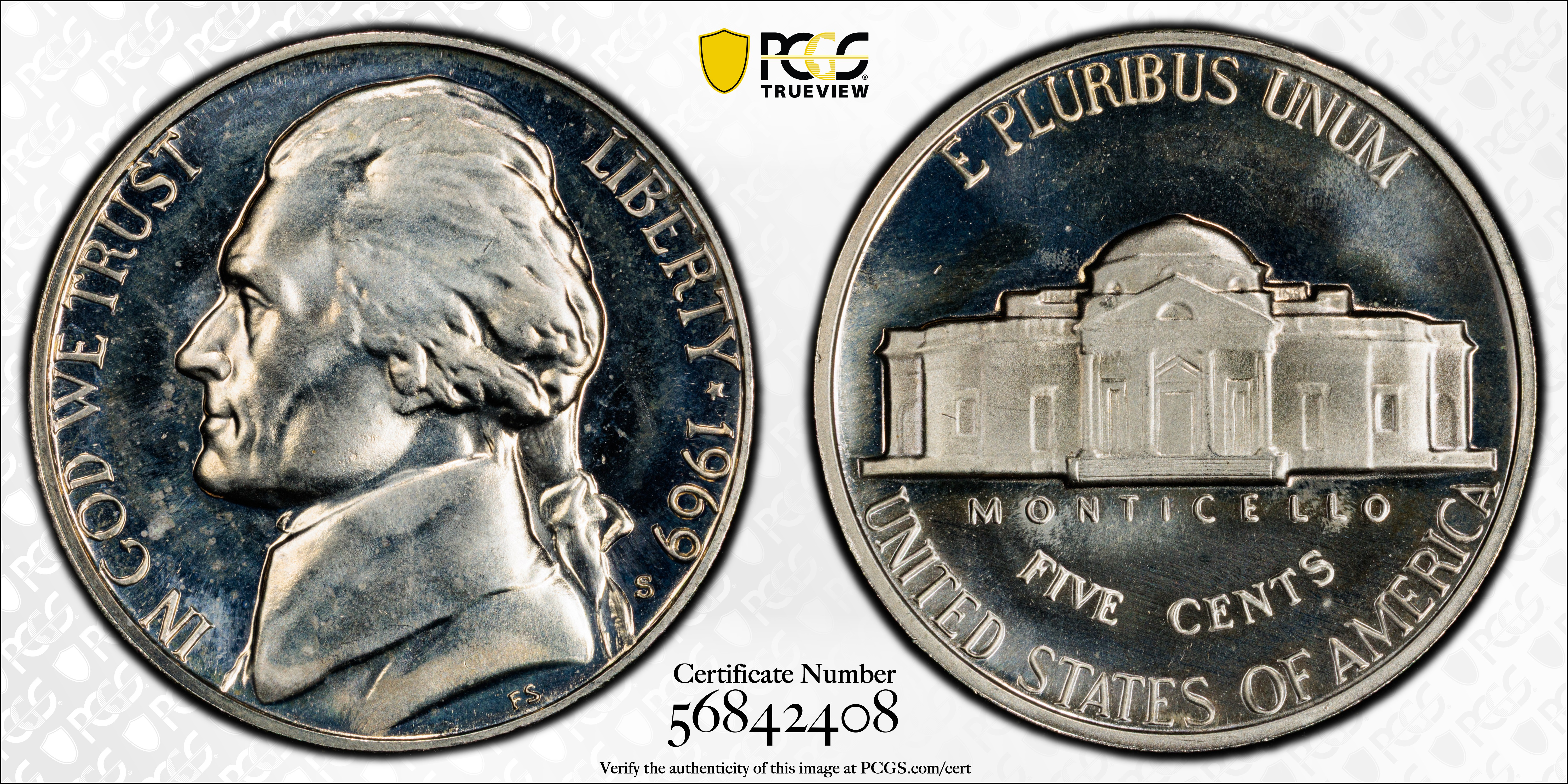 The 1969-S Proof Jefferson Nickel is fairly common in most grades. Only in PR68 Deep Cameo does it begin to be considered scarce but yet easily obtainable at a small premium in this condition. In PR69 Dee Cameo it is scarce with less than a couple hundred examples known. There are no perfect PR70 examples known but with enough searching one can be out there.