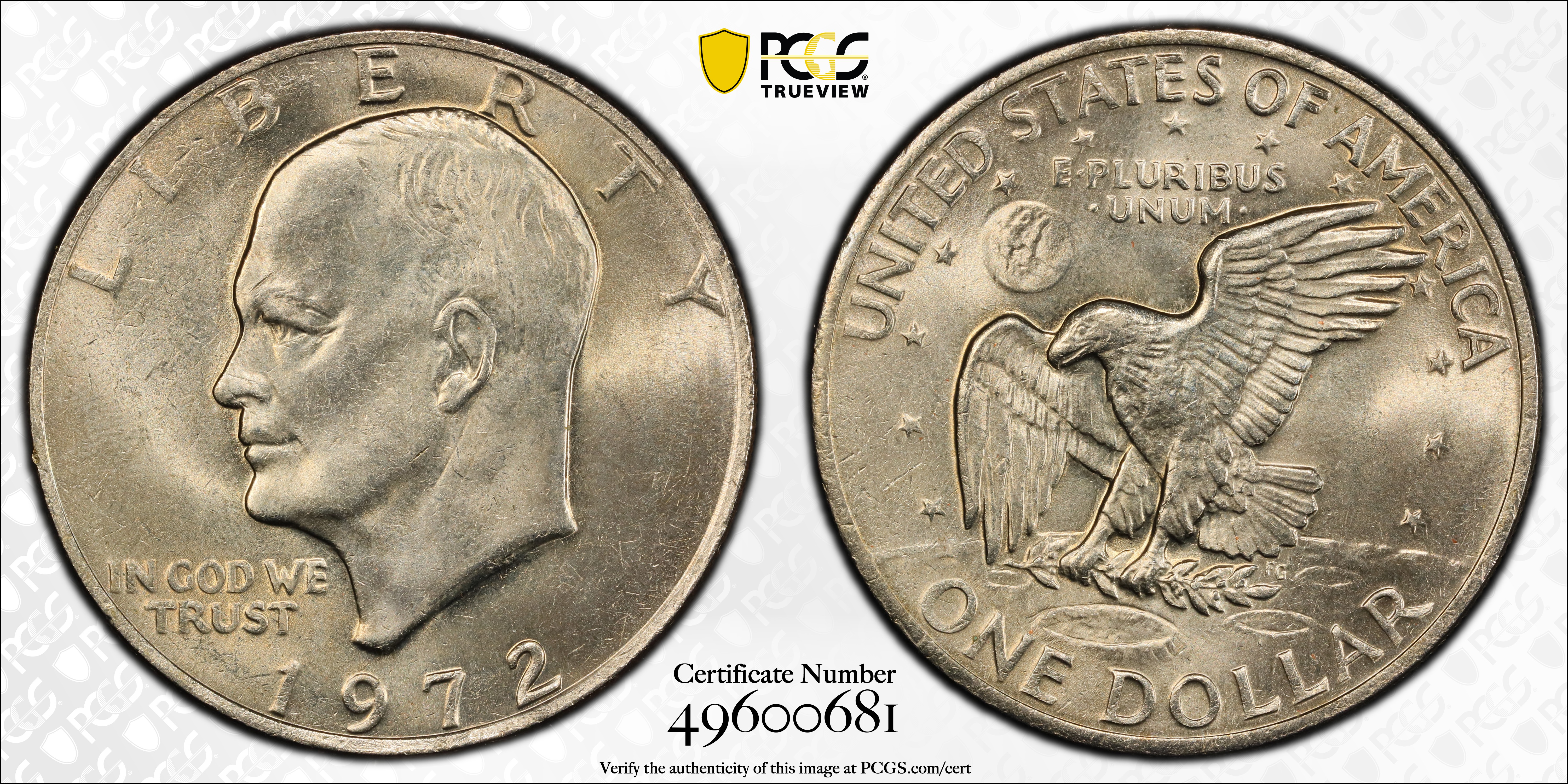 The 1972 Type 2 Eisenhower Dollar is the key coin to the entire series. This variety was only struck from one known reverse die. This is one of the primary reasons why there are so few examples available compared to any other date and mint mark of this series. All 1972 Eisenhower Dollars should illustrate several countries or islands below Florida but on the 1972 Type 2 coins the islands are very flat and almost indistinguishable.