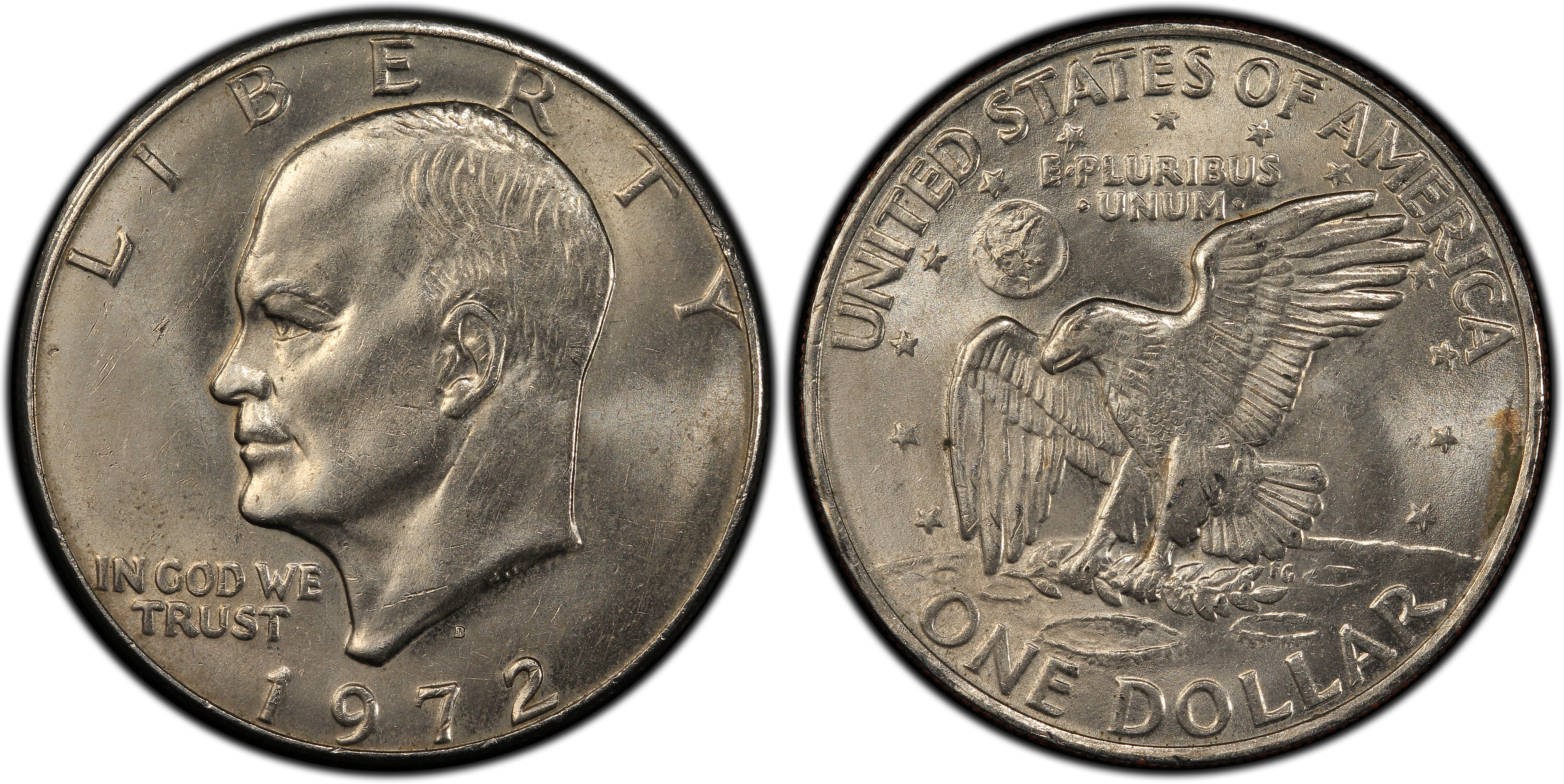 The 1972-D Eisenhower Dollar is scarce only in grades of MS66 and higher. In MS66 grade it compares to the 1973-D. In high uncirculated grades the 1972-D is one of the scarcer D mint mark issues. The 1972-D is probably the second toughest Denver circulation strike Eisenhower dollar from the Type 1 issues and only the 1978-D seems to be scarcer in very high grades.