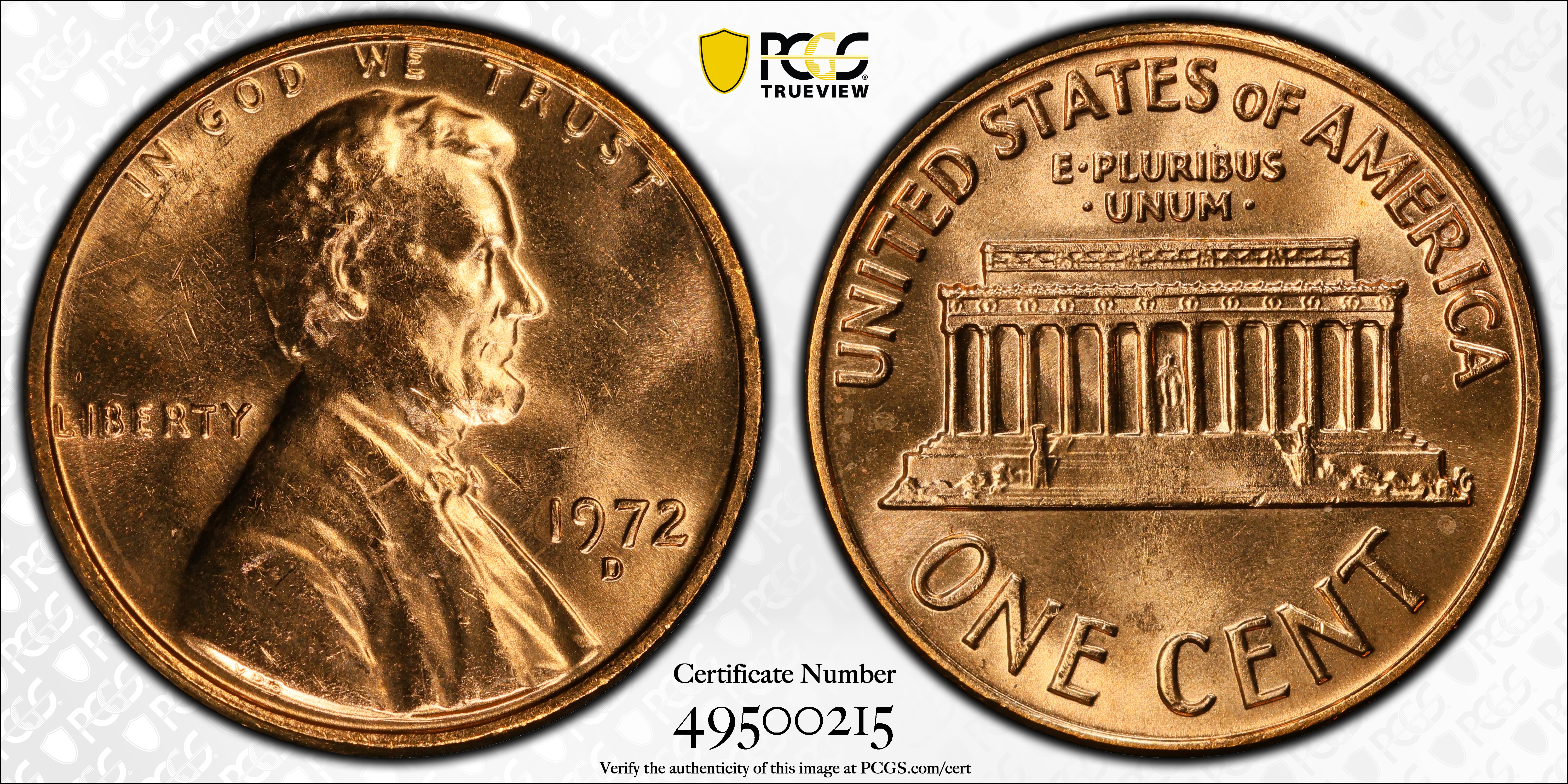1972-D 1C, RD MS65RD Certification #49500215, PCGS #2956