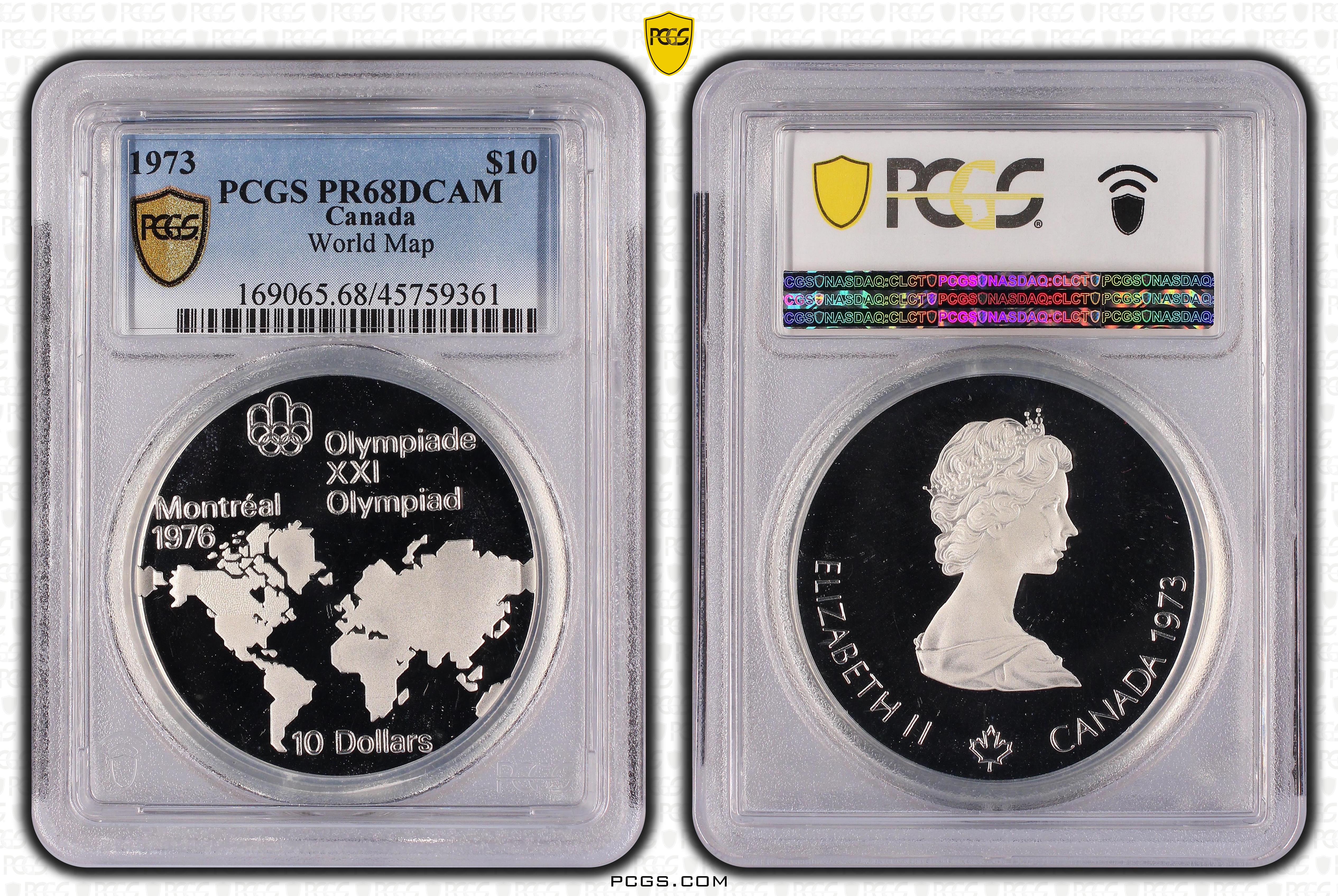 1973 $10 World Map, DCAM PR68DCAM Certification #45759361, PCGS #169065