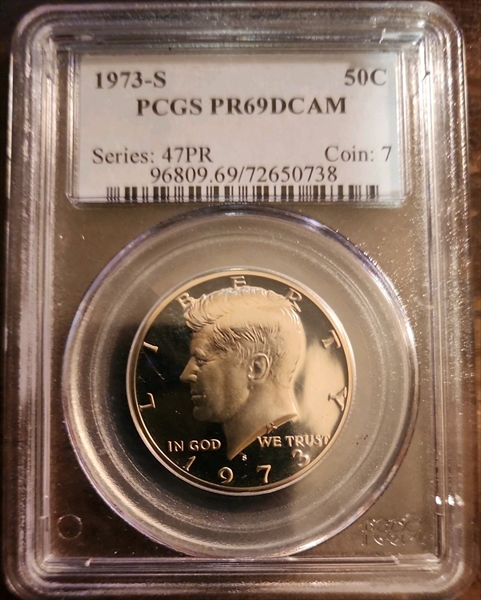 The 1973-S Proof Kennedy Half is very common in most grades even in PR69 Deep Cameo. Only in perfect PR70 Deep Cameo are they very scarce.