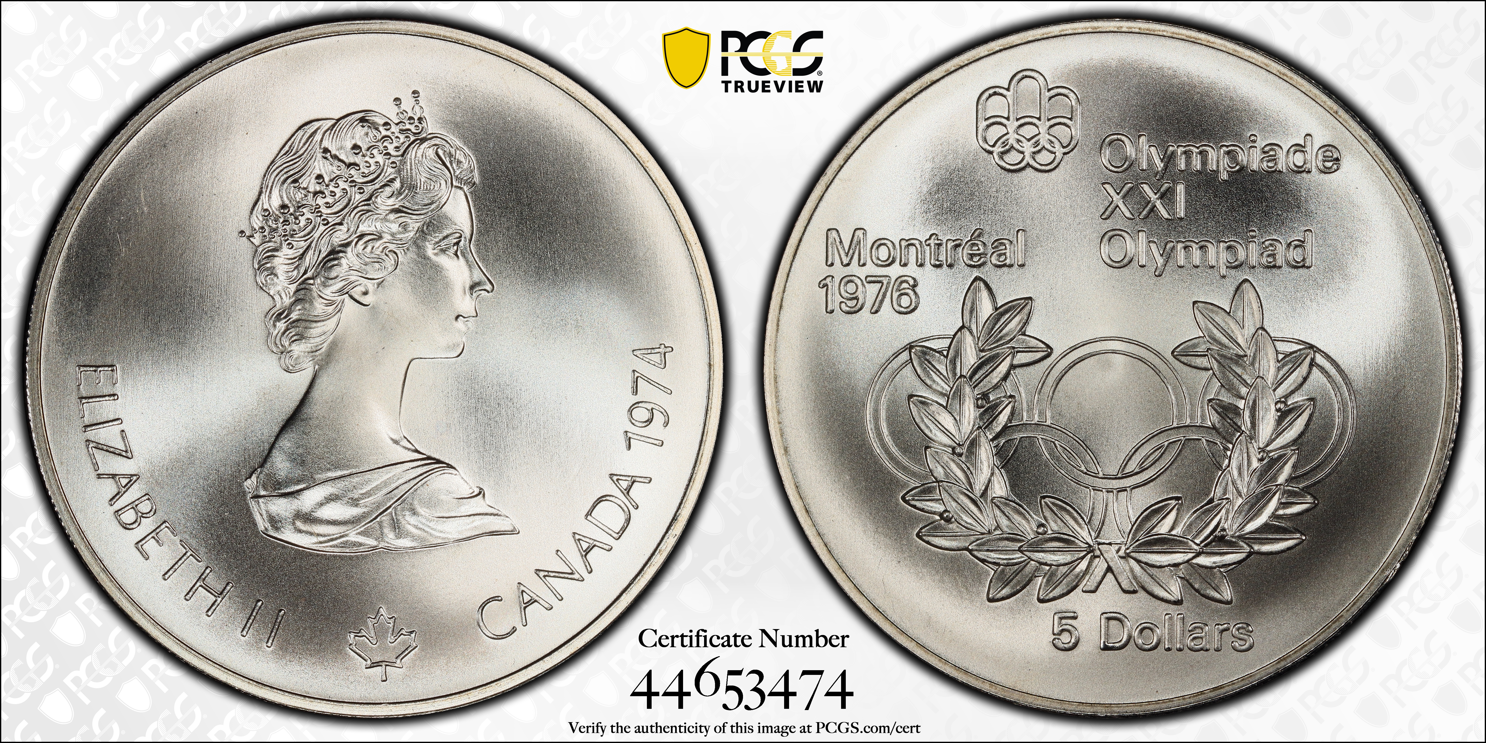 1974 $5 Olympic Rings MS68 Certification #44653474, PCGS #33506