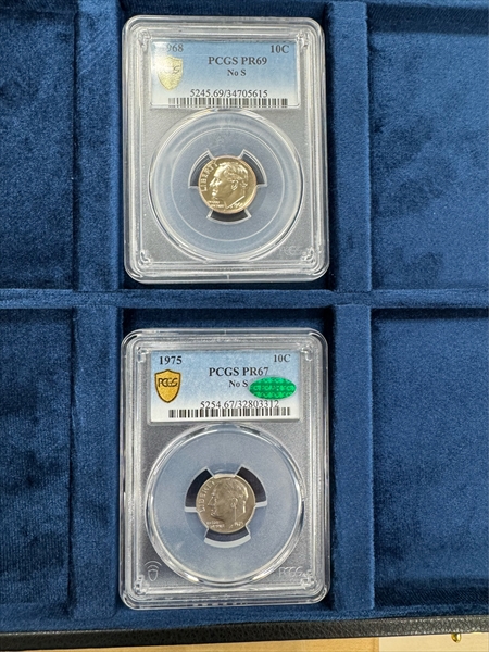 The 1975 No S Proof Dimes were struck with regular Proof Dies for that year, with the exception that the obverse die lacked the S mint mark. The only example graded is a PCGS PR68 that was submitted to PCGS in June 2011. This is the same coin that was submitted to Coin World in 1977. The coin will be auctioned off by Stacks Bowers Galleries' at the ANA on August 16 - 20, 2011.