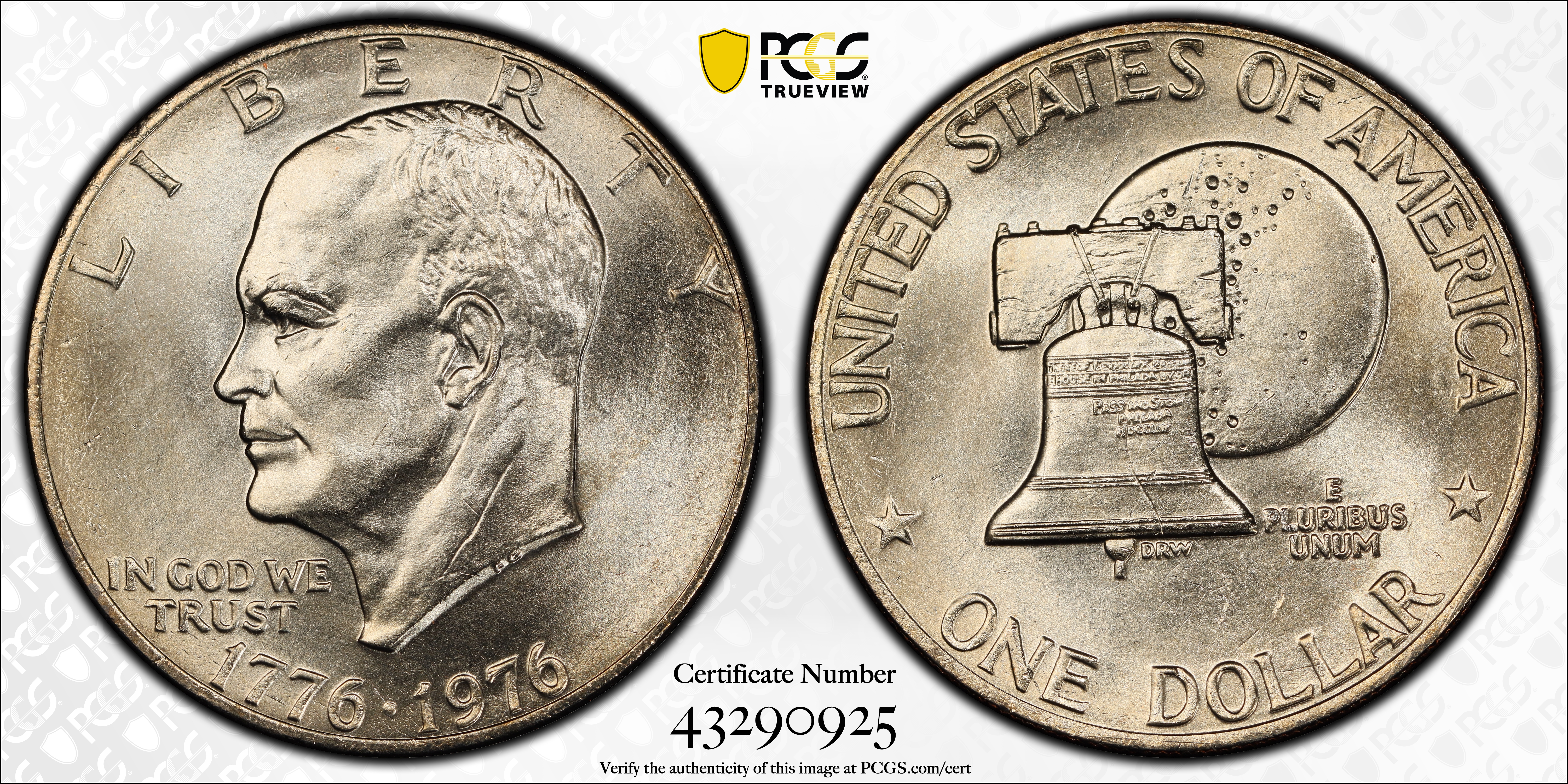 In 1976 the U.S. Mint struck four different types of Bicentennial Eisenhower Dollars. From the four different coins, the 1976 Type 2 is common in MS65 condition and lower. It is scarce in MS66 condition and very difficult to find in MS67 or higher.