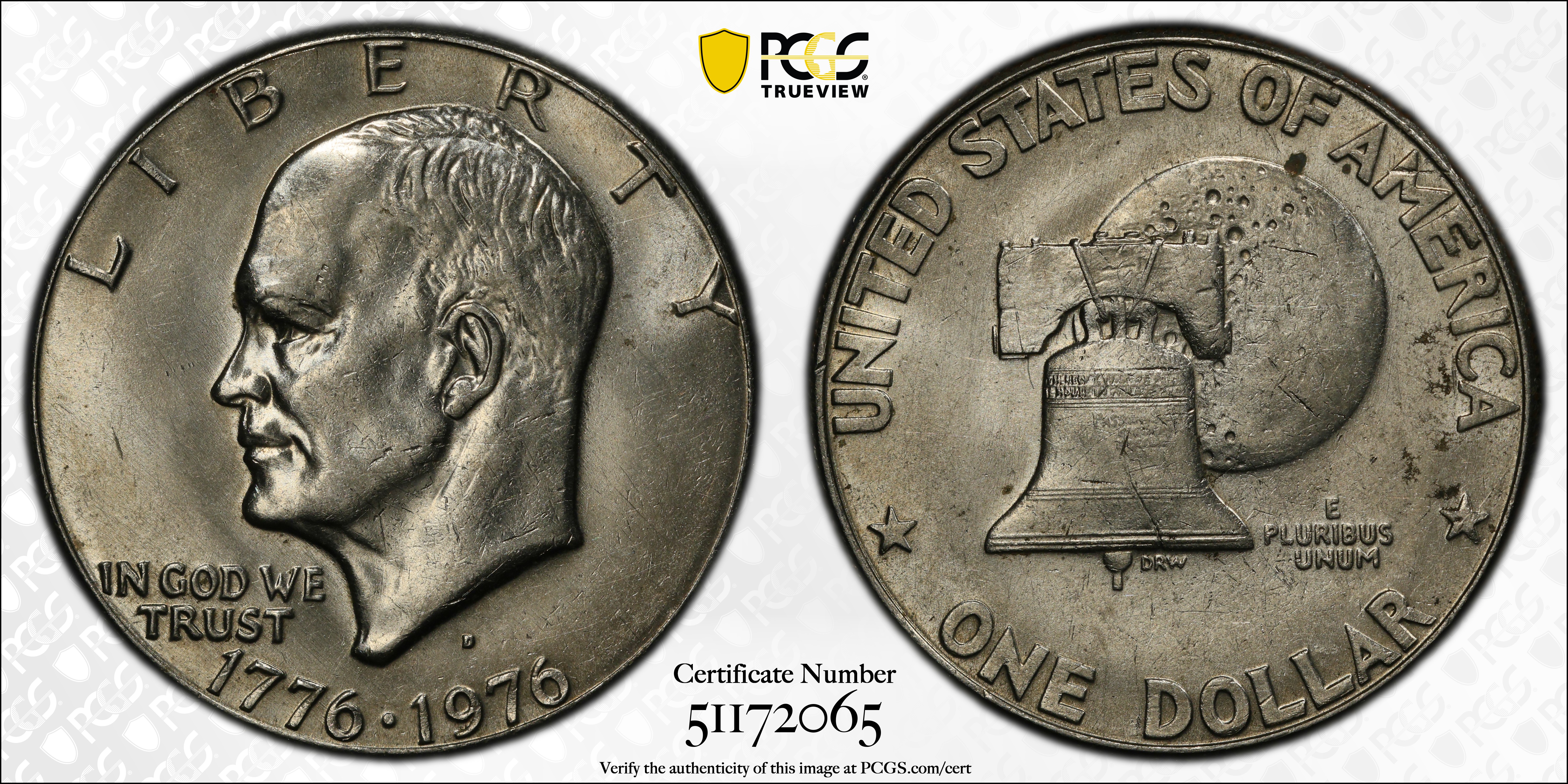 In 1976, the U.S. Mint at Denver produced Eisenhower Dollars with two different reverses. Type 1 has thicker letters while Type 2 has thinner letters. Both types are very common, but the Type 1 is not as common as the Type 2. Superb (MS67) examples of both types are elusive.