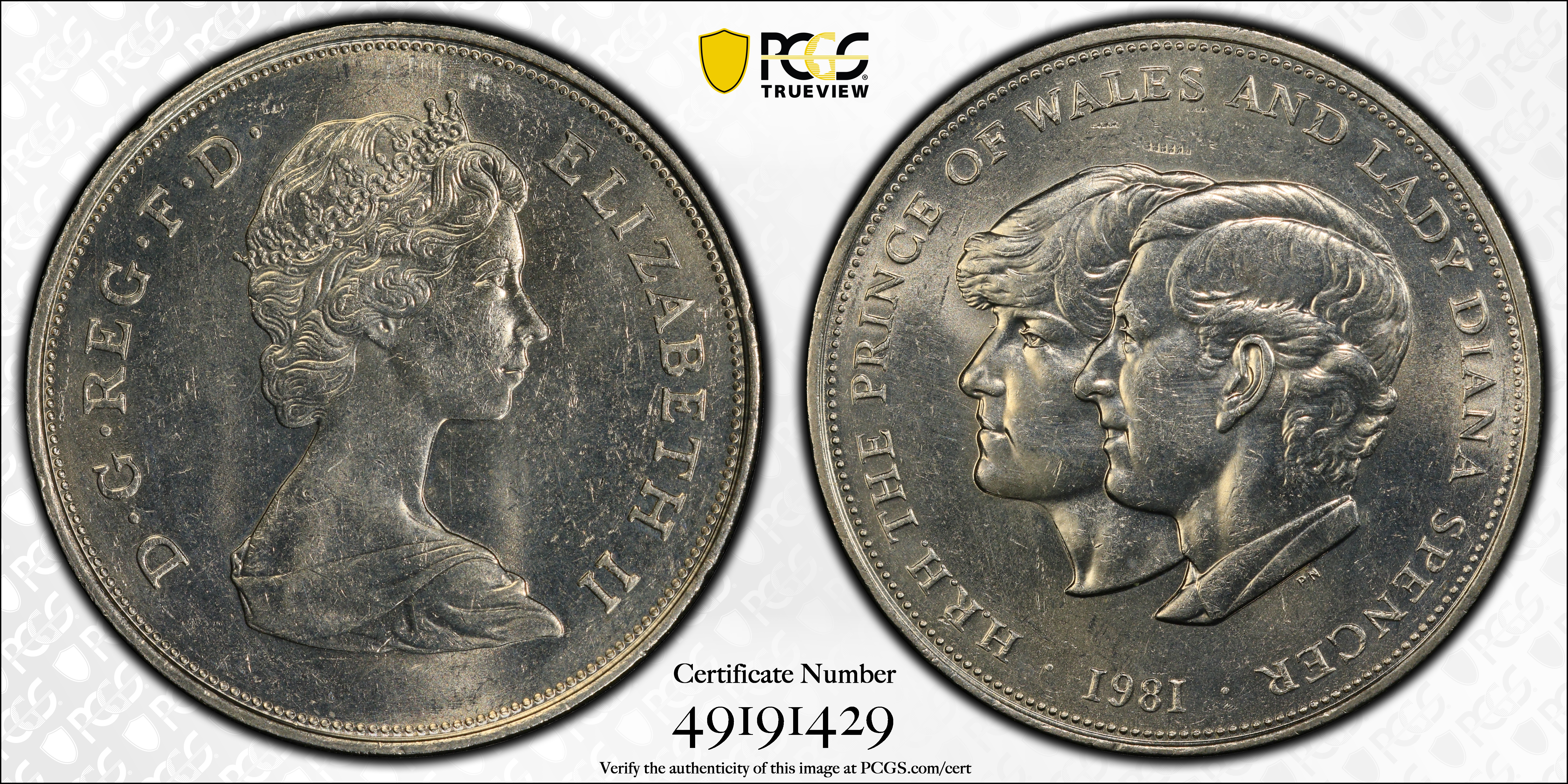 1981 25p S-LL4 Charles & Diana Cu/Ni MS62 Certification #49191429, PCGS #142612