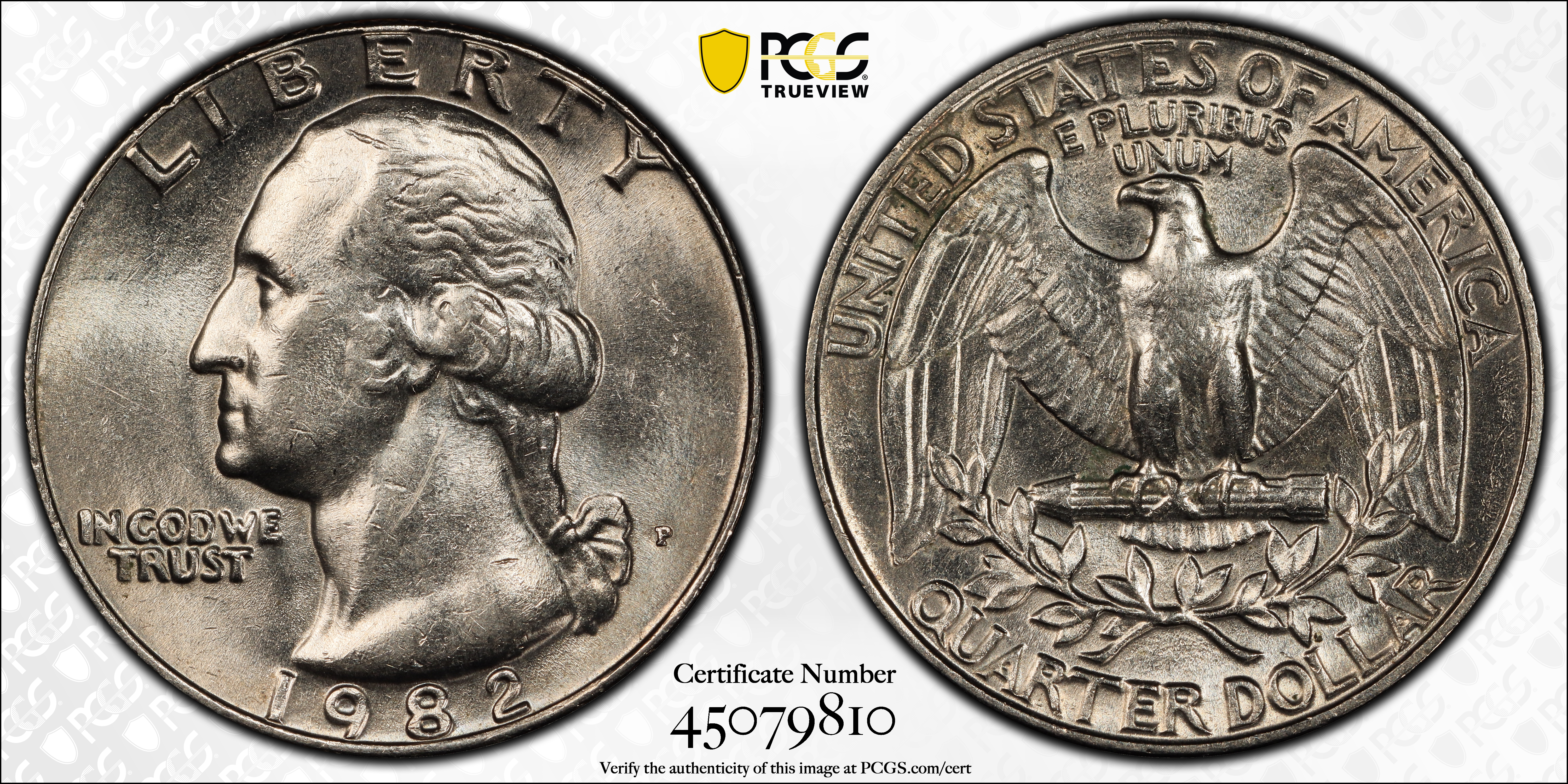 In 1982 and 1983 the Mint did not produce any Mint Sets. Therefore, it is much more difficult to find 1982-1983 P and D Quarters in higher Uncirculated grades. Even raw examples in MS64 command a significant premium of about $5 - $10 or so. In MS65 condition they are very tough. In MS66 condition they are extremely scarce. In MS67 they are even more difficult to find and definitely worth setting aside if one is found.