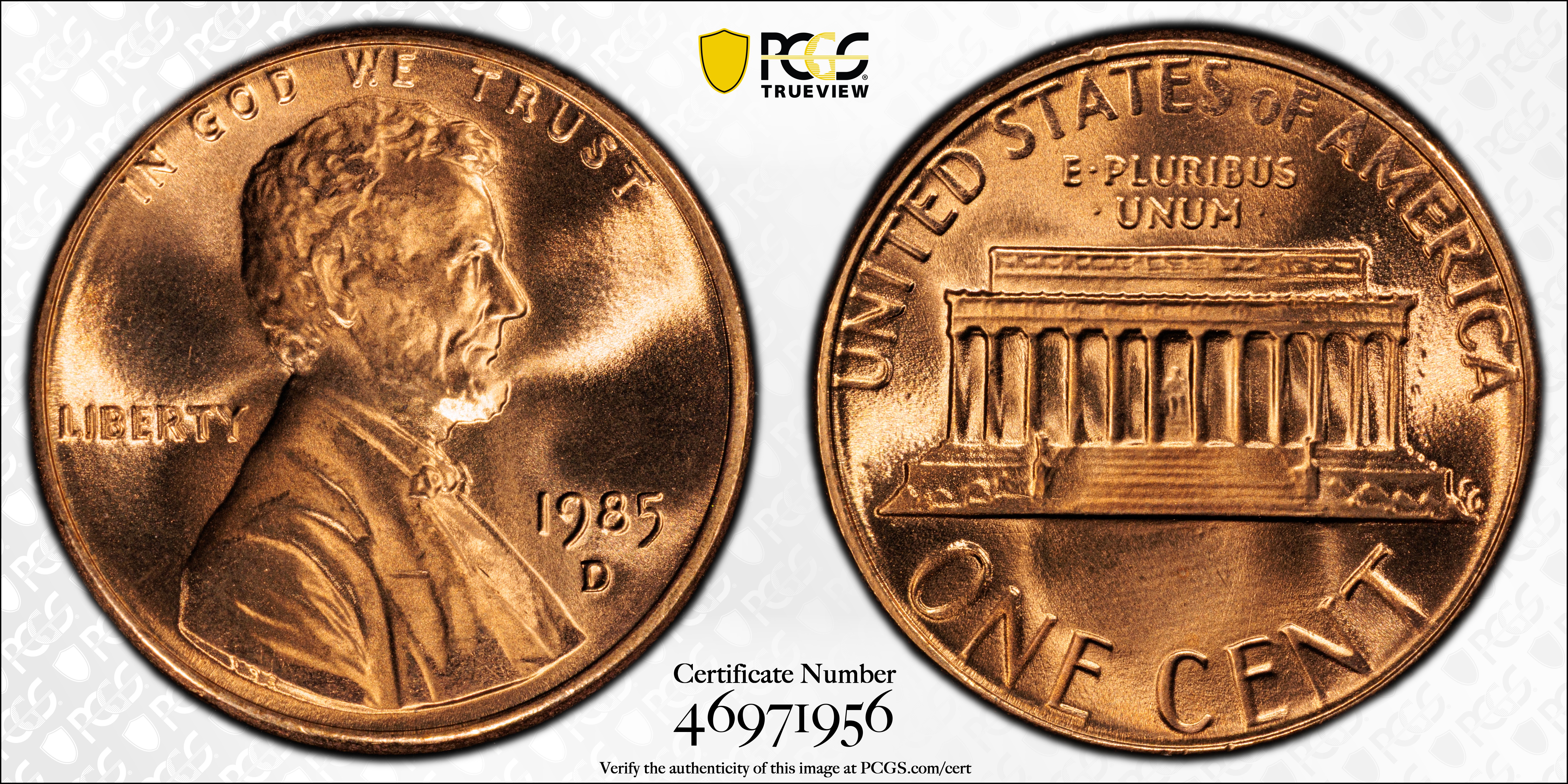 Collectors can be picky when it comes to the 1985-D Lincoln Cent, as over 5.287 billion were struck. Therefore, examples up to about MS67 are very easily obtainable and very inexpensive. Examples in MS68 are scarce and anything grading higher than MS68 is very scarce to rare.