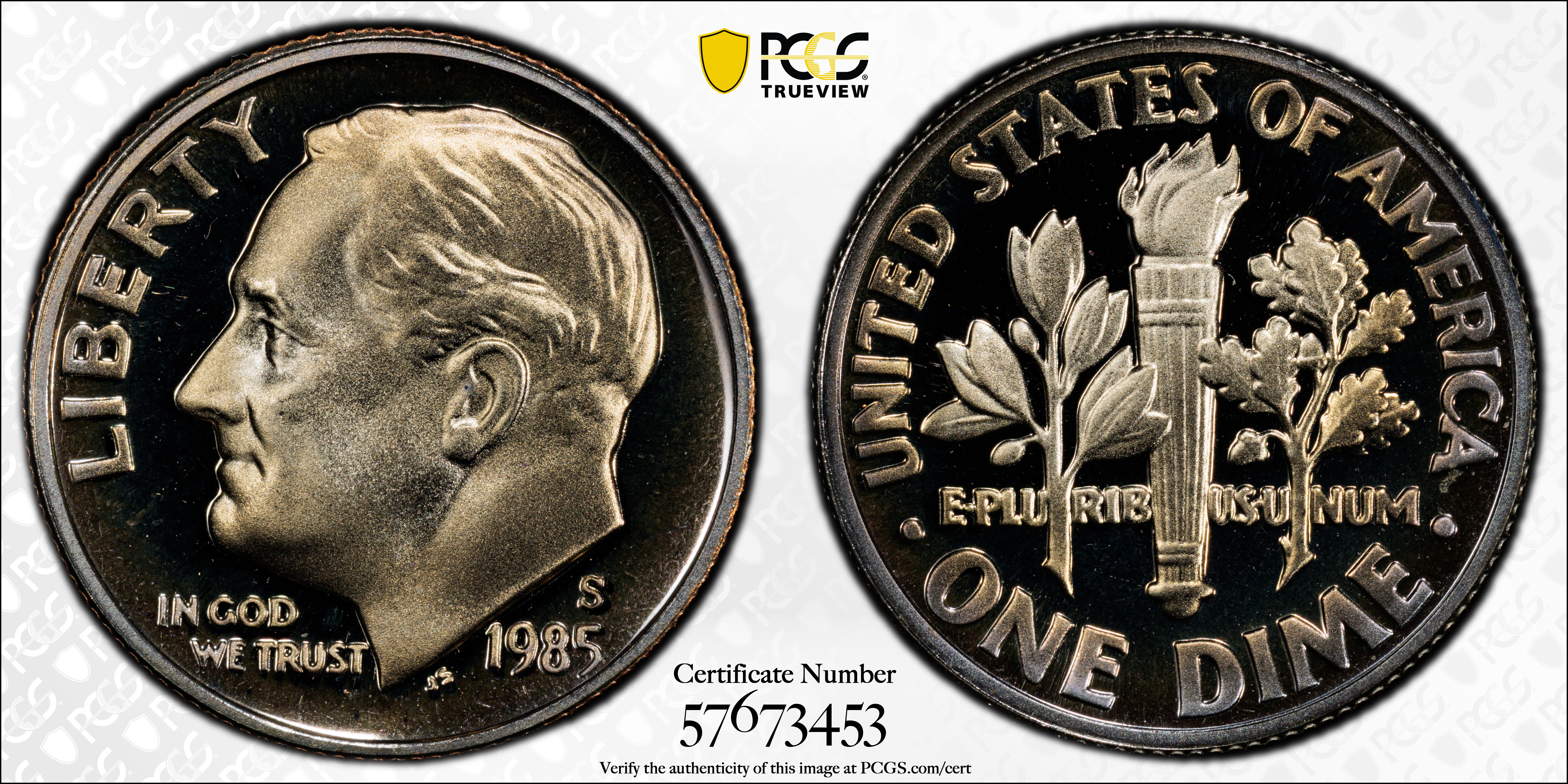 1985-S 10C, DCAM PR70DCAM Certification #57673453, PCGS #95267