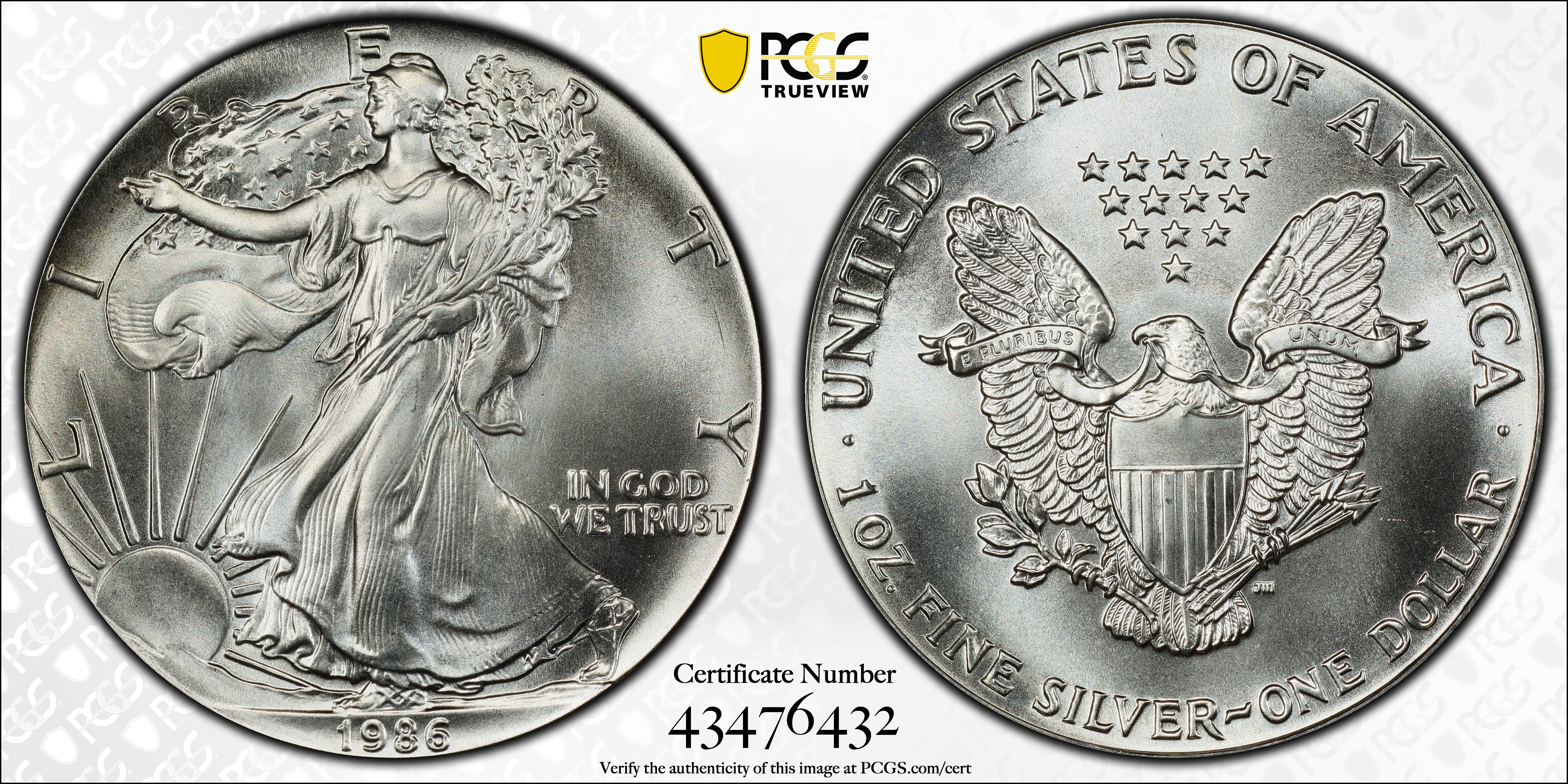 1986 $1 Silver Eagle MS68 Certification #43476432, PCGS #9801
