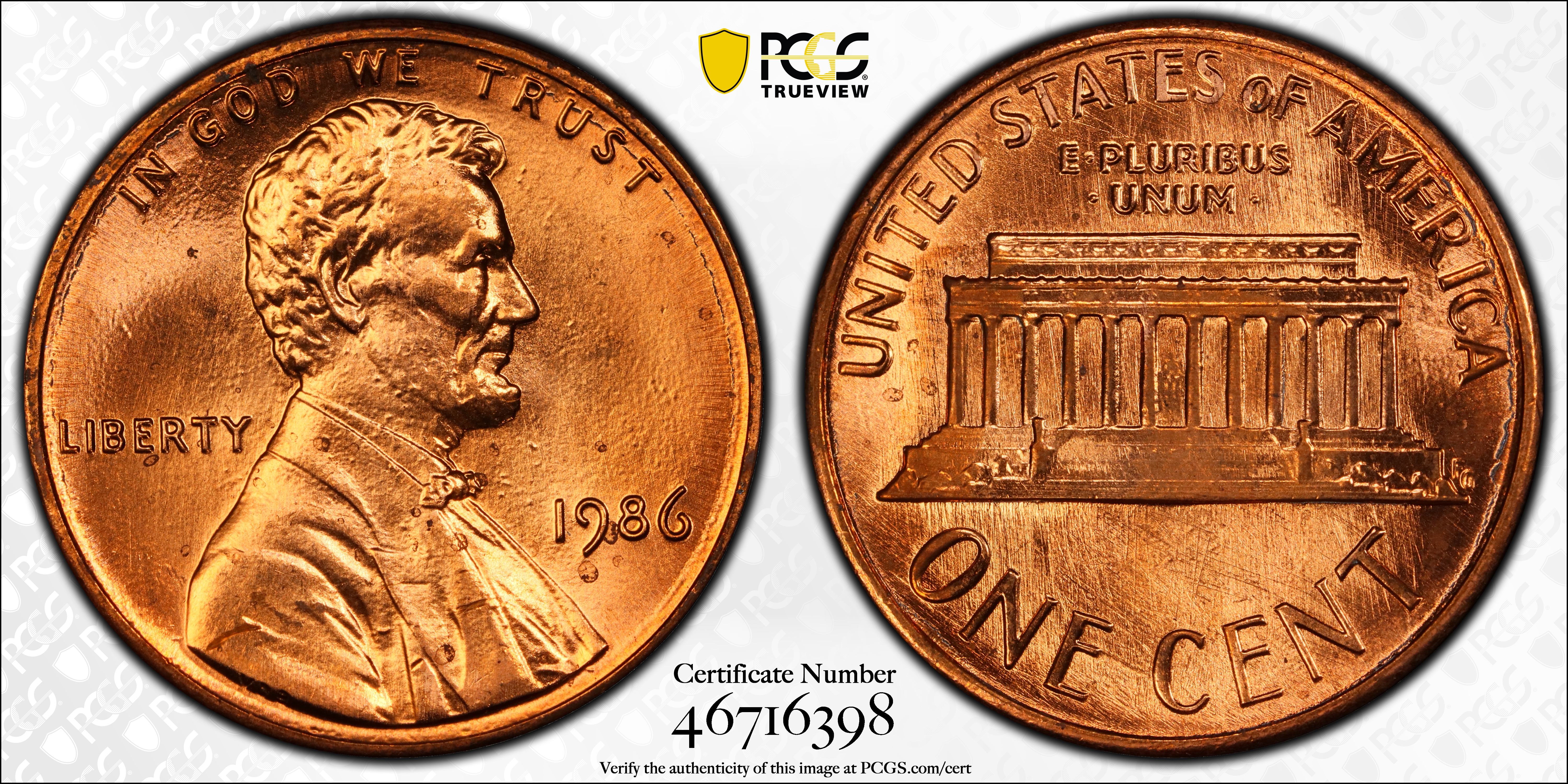 1986 1C, RD MS65RD Certification #46716398, PCGS #3124