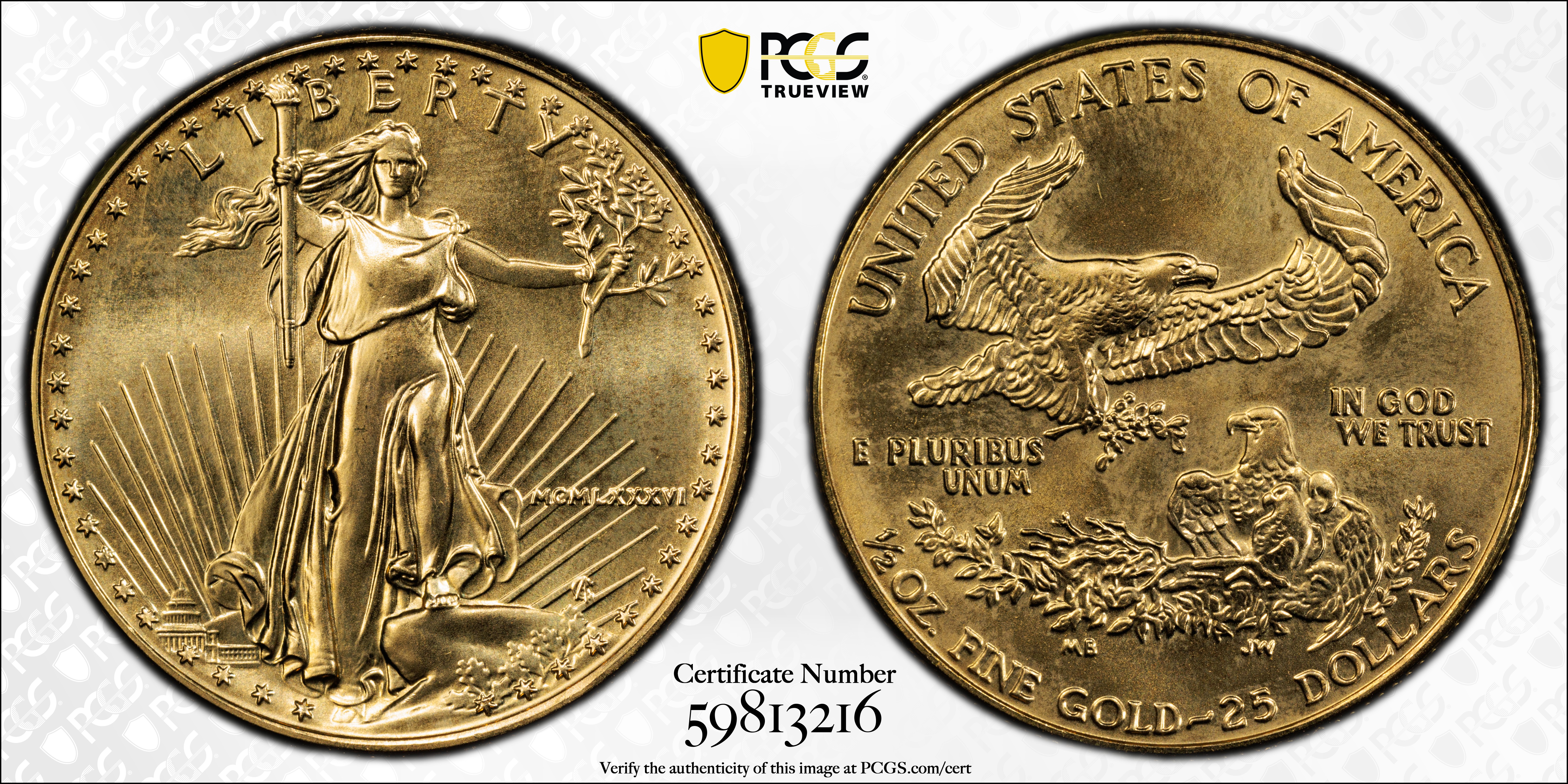 1986 $25 Gold Eagle MS69 Certification #59813216, PCGS #9805