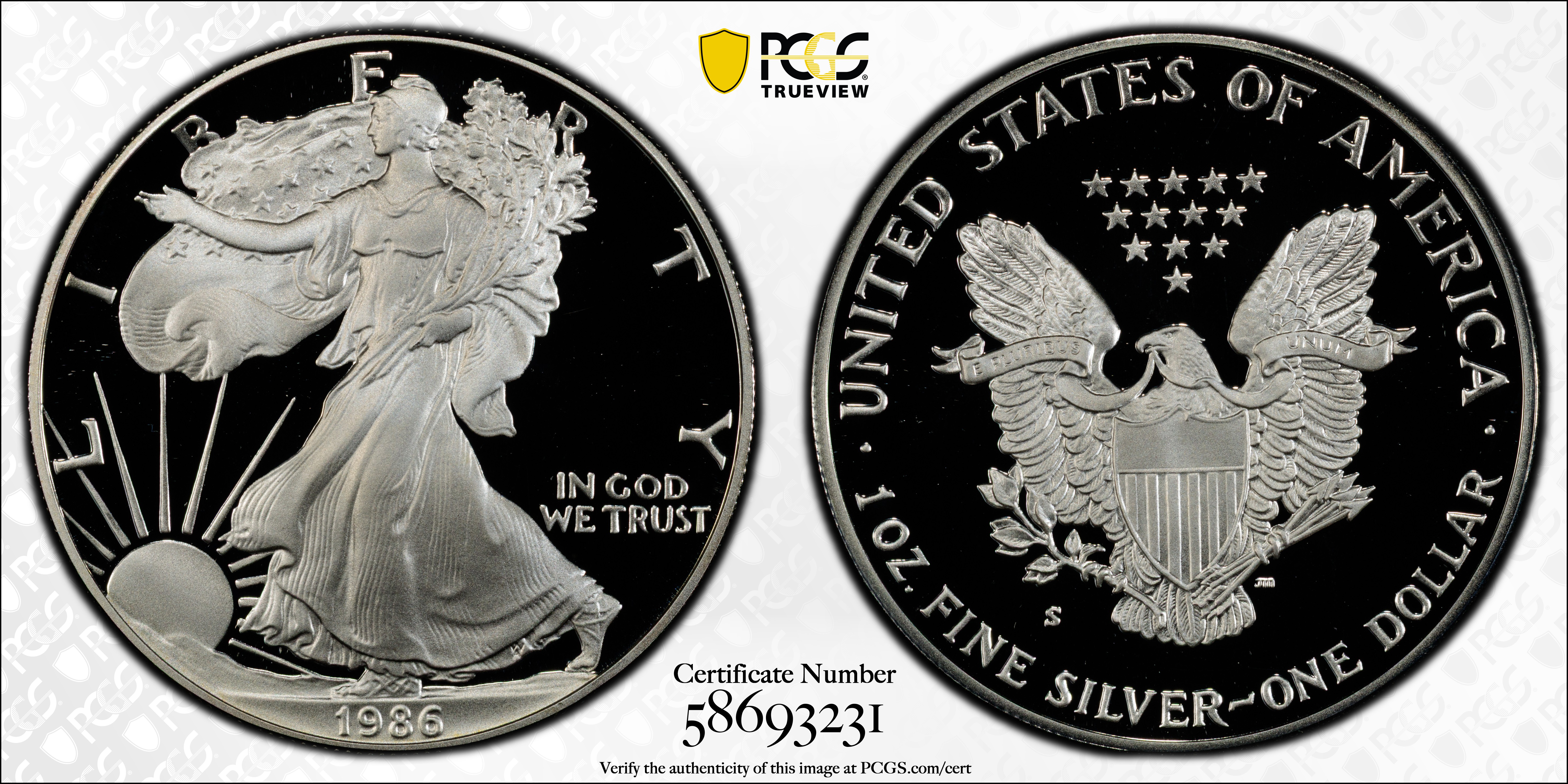 1986-S $1 Silver Eagle, DCAM PR70DCAM Certification #58693231, PCGS #9802