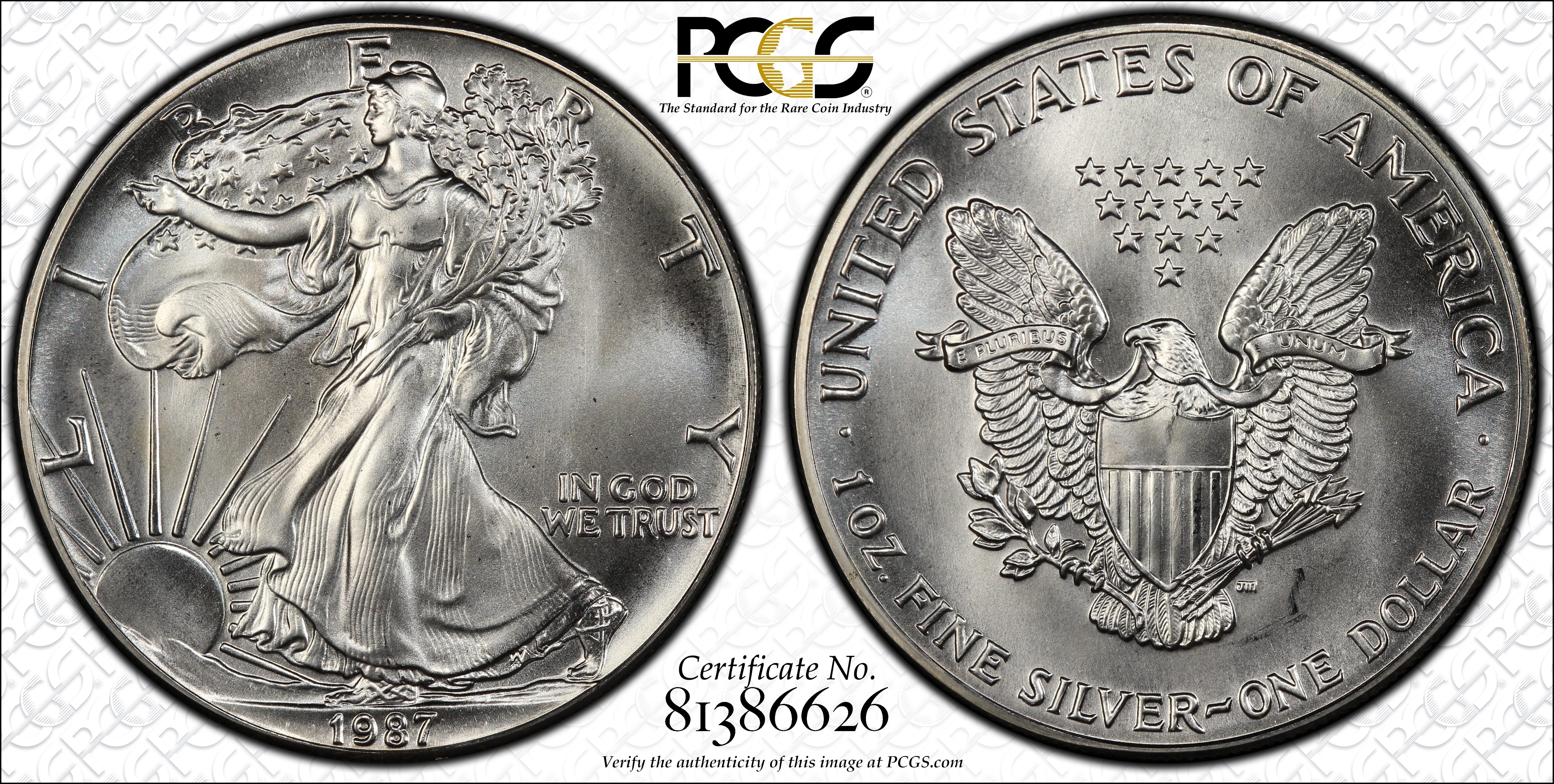 1987 $1 Silver Eagle MS68 Certification #81386626, PCGS #9808