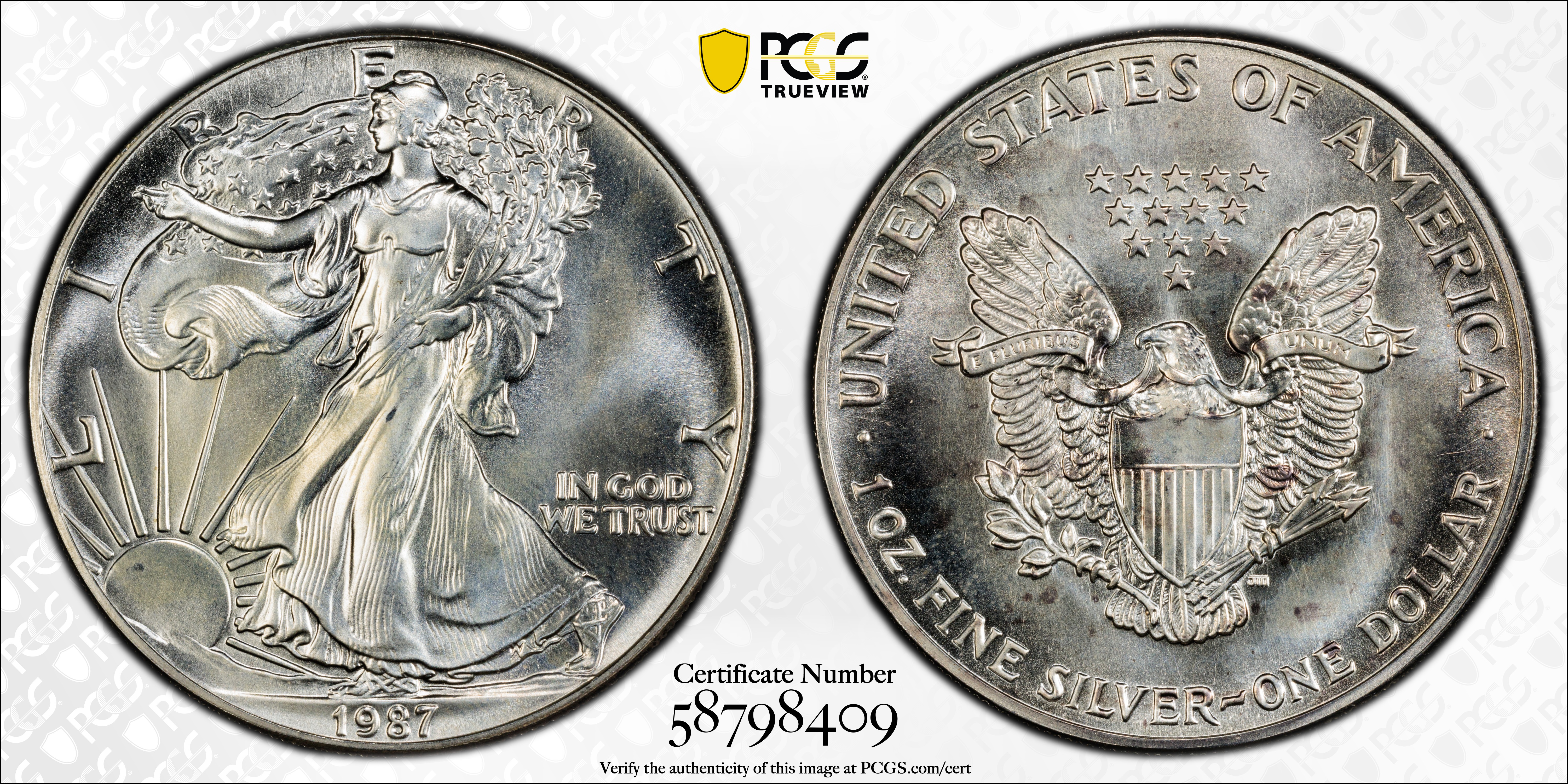 1987 $1 Silver Eagle MS67 Certification #58798409, PCGS #9808