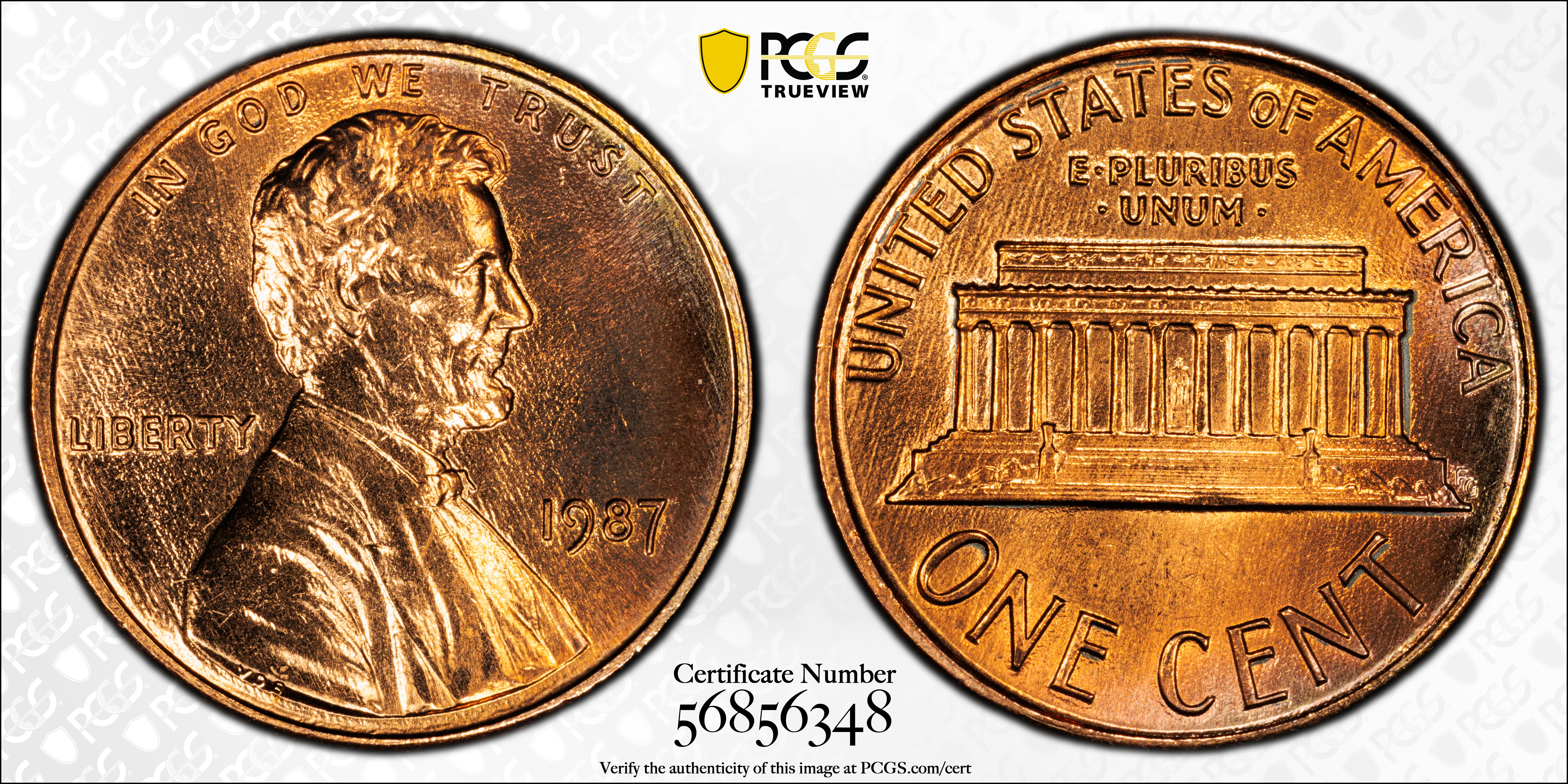 1987 1C, RD MS65RD Certification #56856348, PCGS #3065