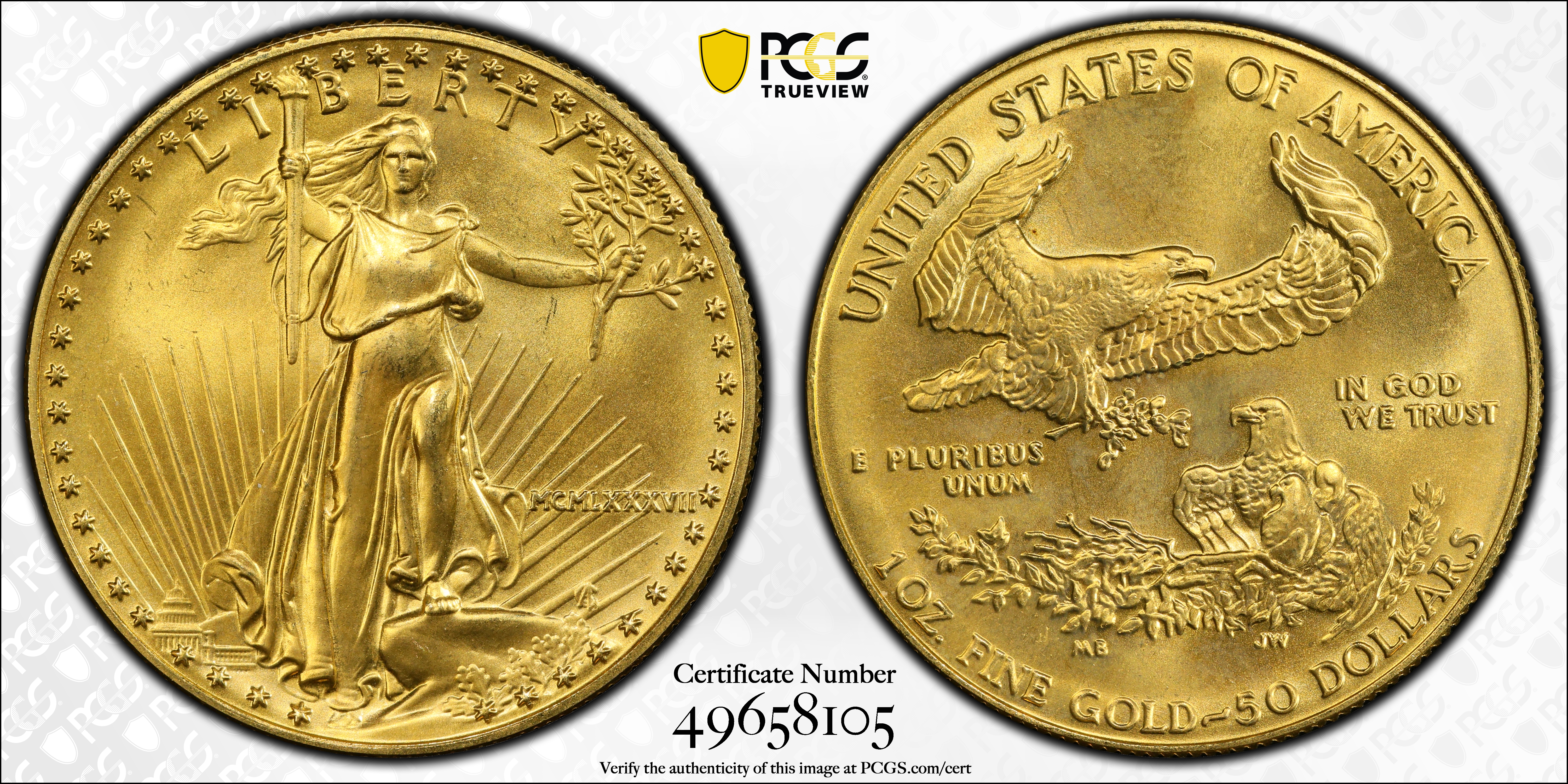 1987 $50 Gold Eagle MS69 Certification #49658105, PCGS #9814