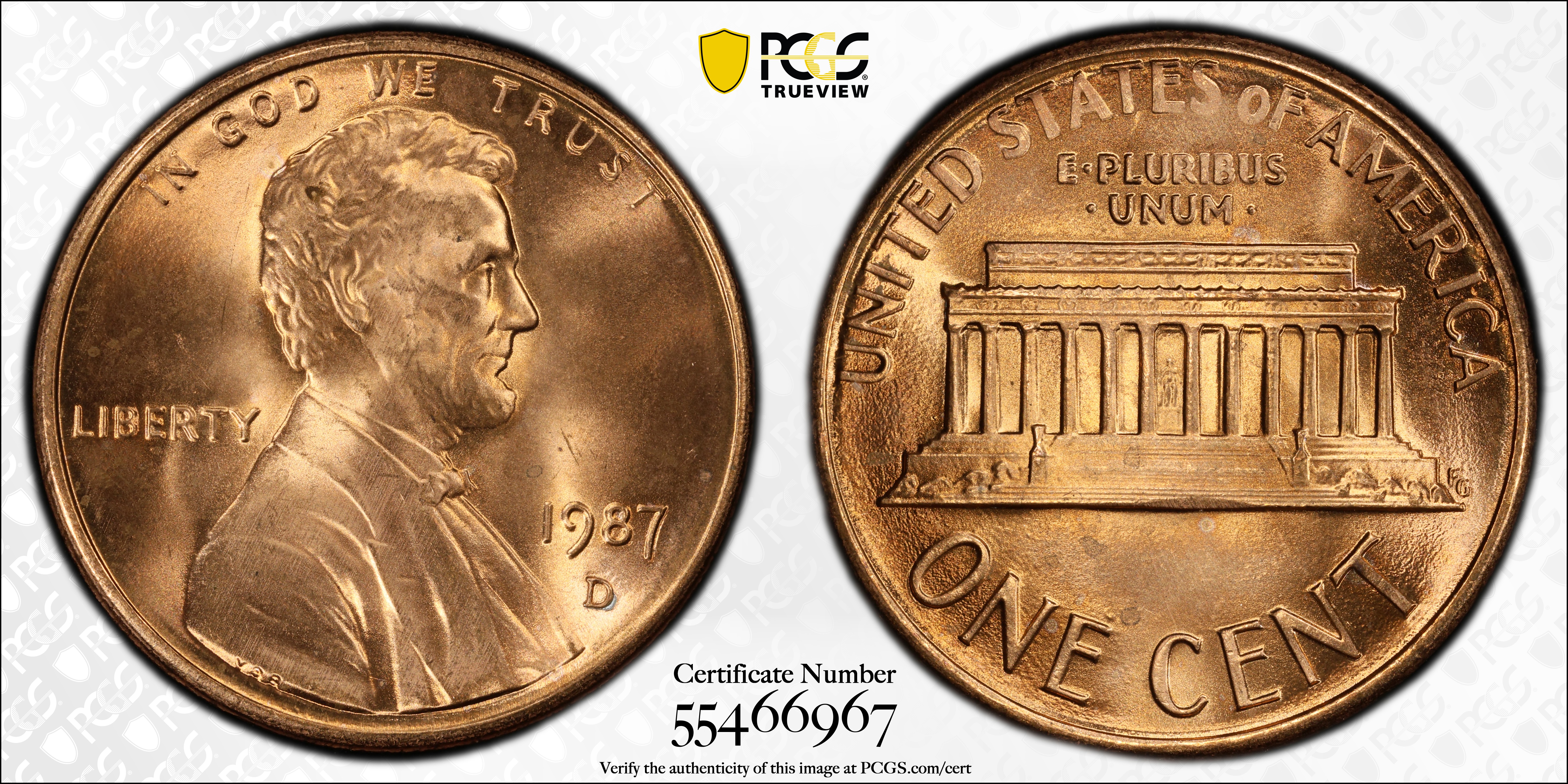 1987-D 1C, RD MS67RD Certification #55466967, PCGS #3080