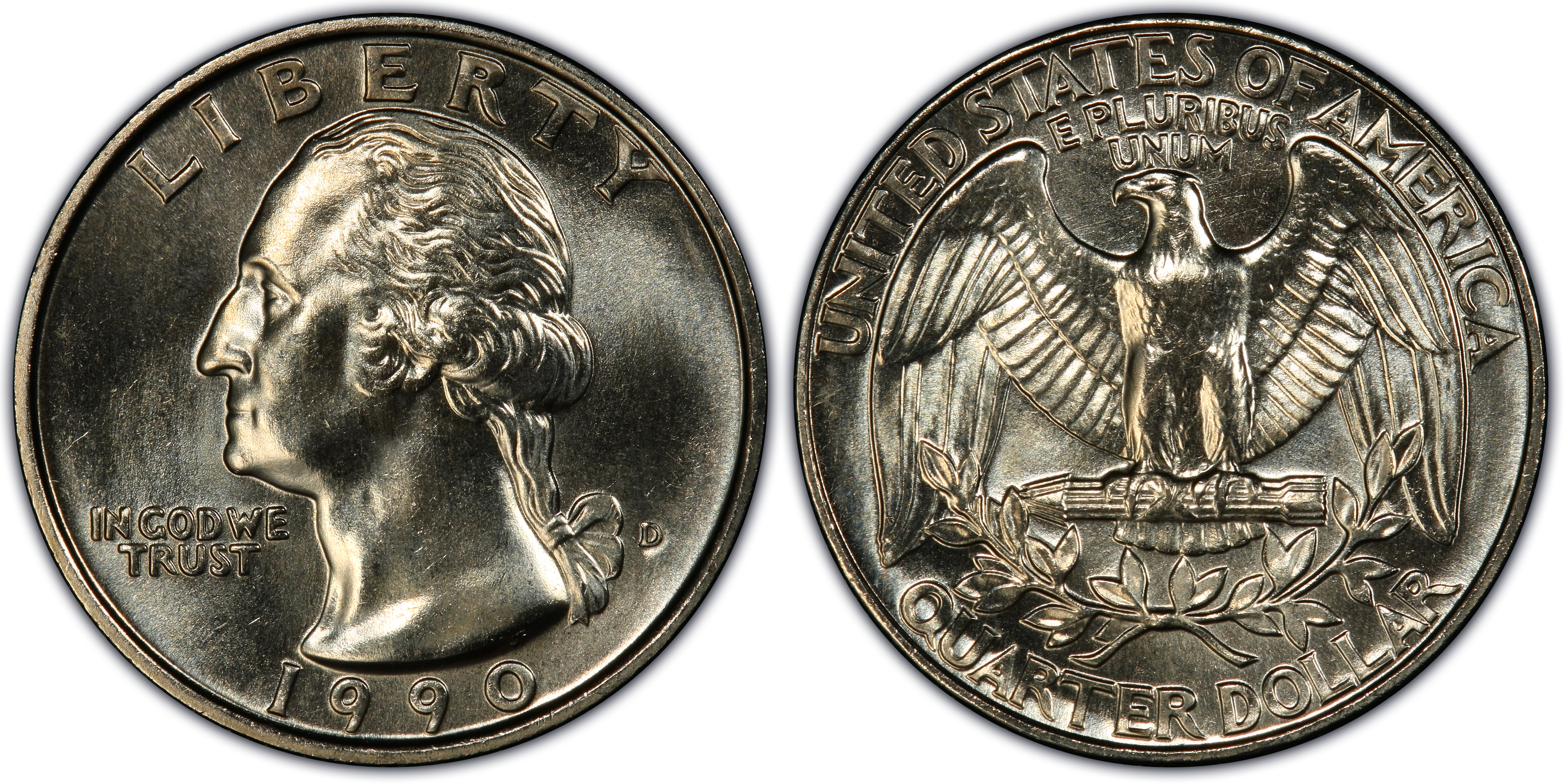The 1990-D Washington Quarter is very common as the Mint struck them in the hundreds of millions. Only examples in MS66 appear to be somewhat scarce but still easily obtainable at a very small premium. Examples in MS67 condition are really scarce with less than a few dozen known. There is at least one known example in PCGS MS67+ condition but none have been graded higher.