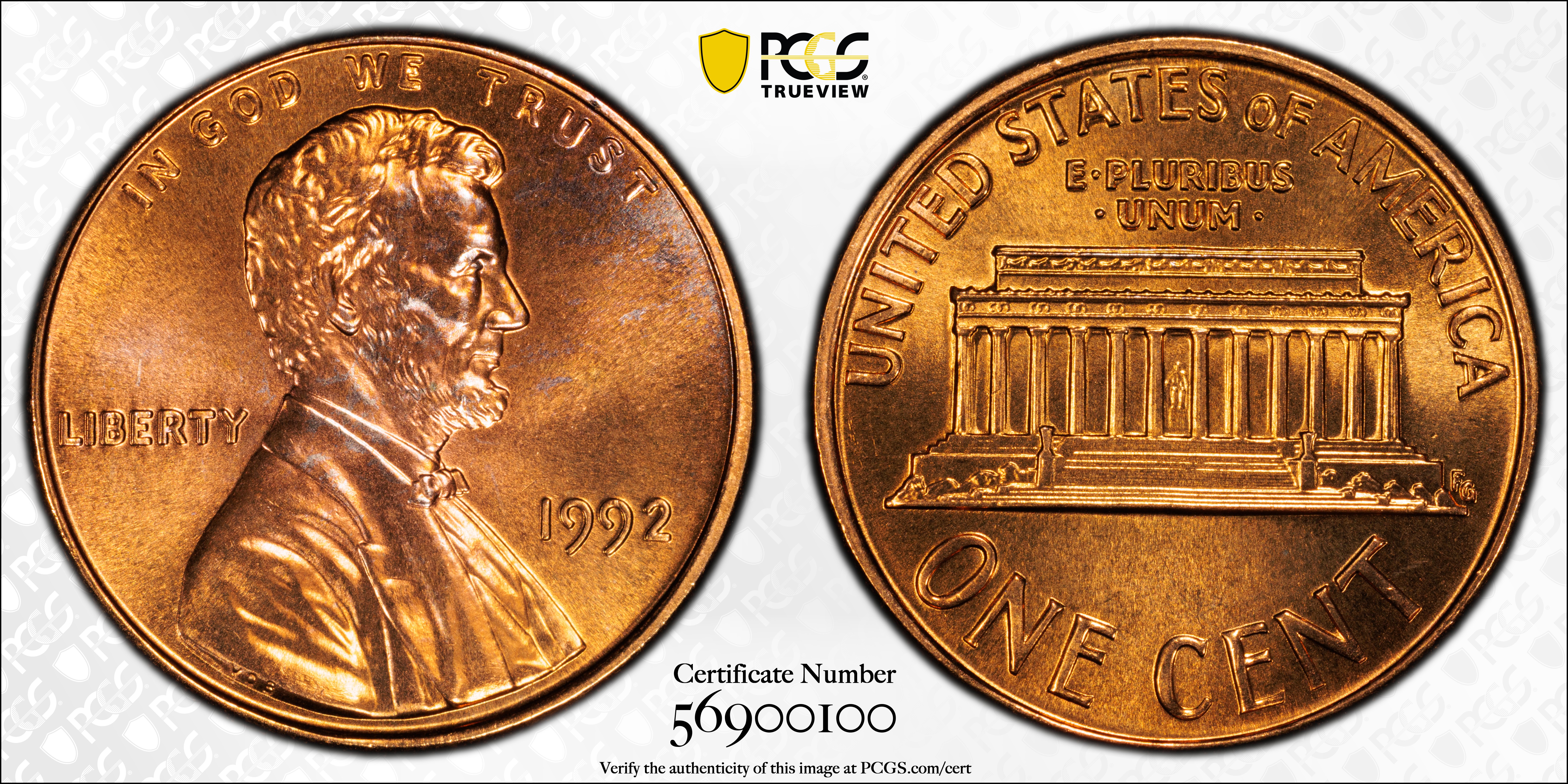 1992 1C, RD MS68RD Certification #56900100, PCGS #3098