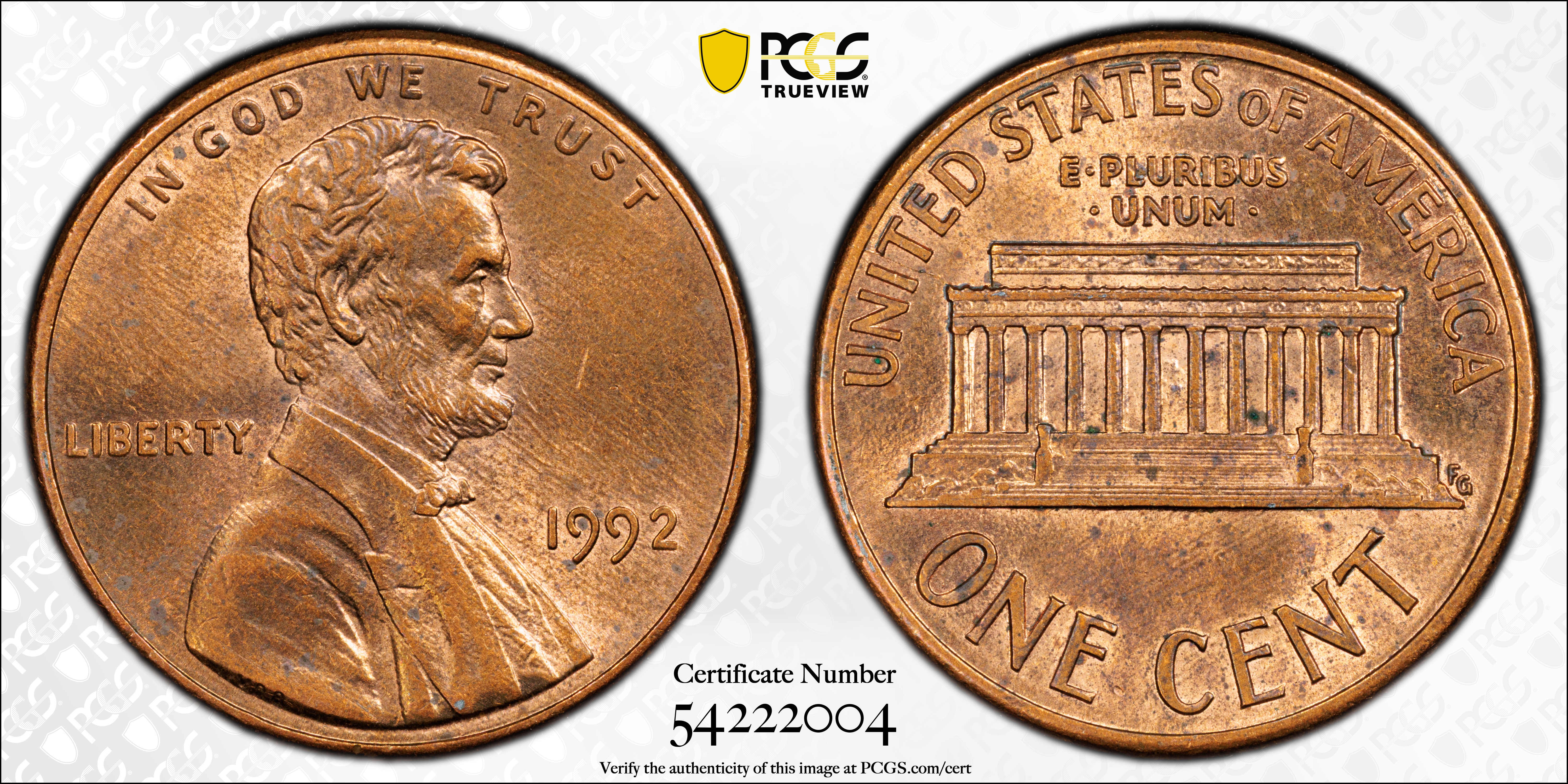 1992 1C, RB MS63RB Certification #54222004, PCGS #3097
