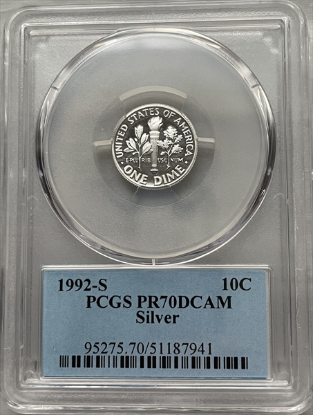 1992-S 10C Silver, DCAM PR70DCAM Certification #51187941, PCGS #95275