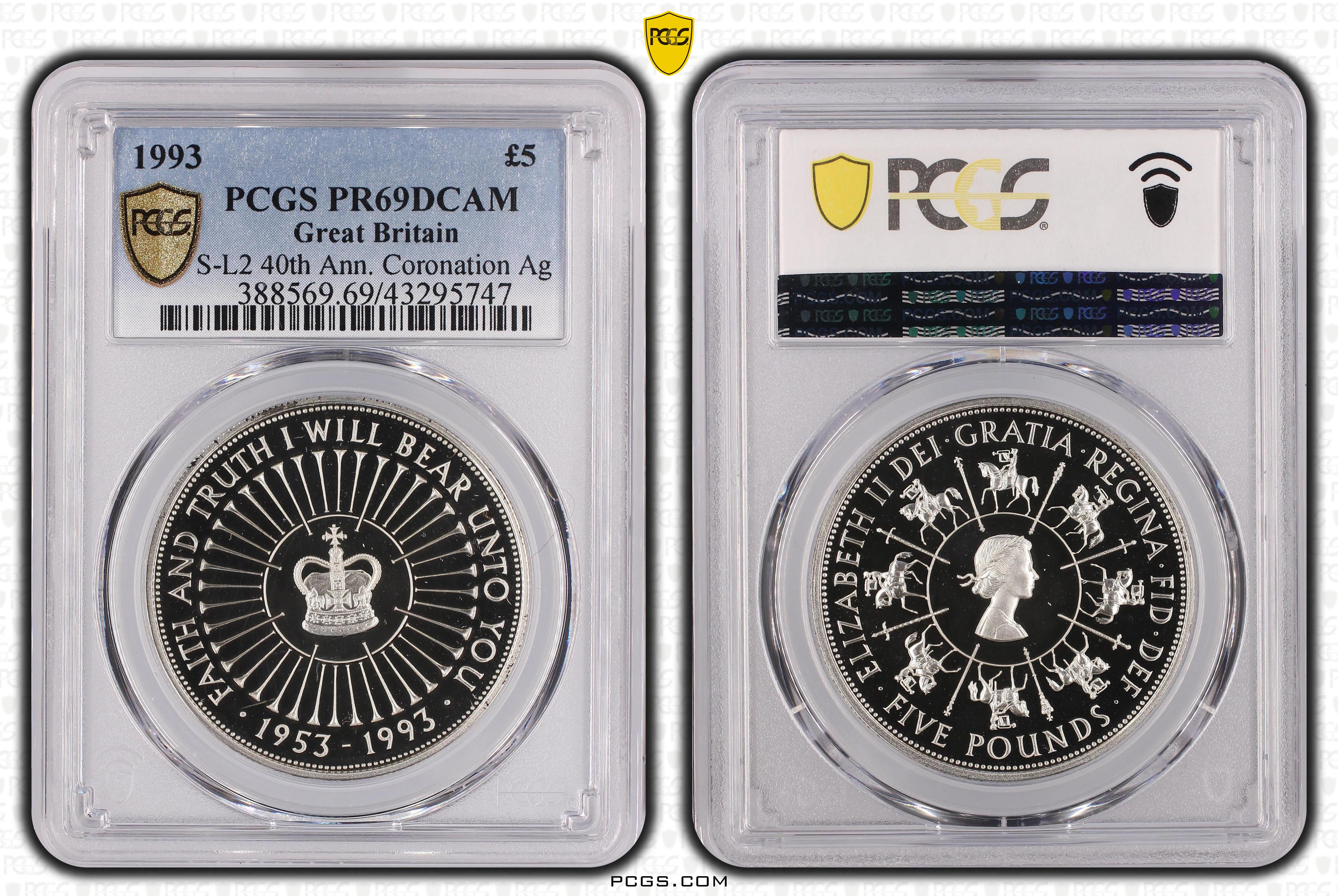 1993 £5 S-L2 40th Ann. Coronation Ag, DCAM PR69DCAM Certification #43295747, PCGS #388569