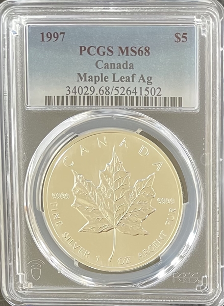 1997 $5 Maple Leaf Ag MS68 Certification #52641502, PCGS #34029