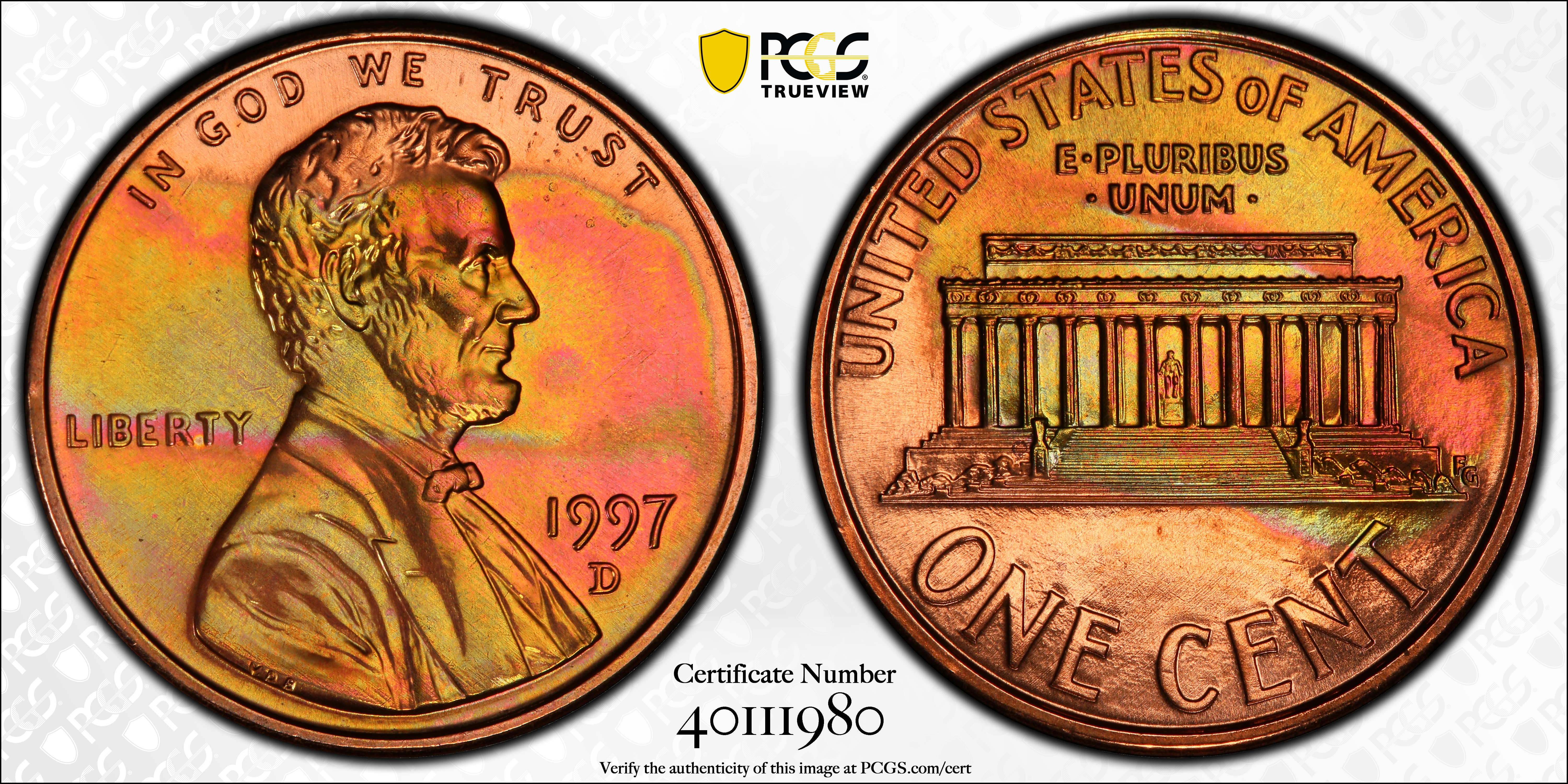 1997-D 1C, RD MS65RD Certification #40111980, PCGS #3142