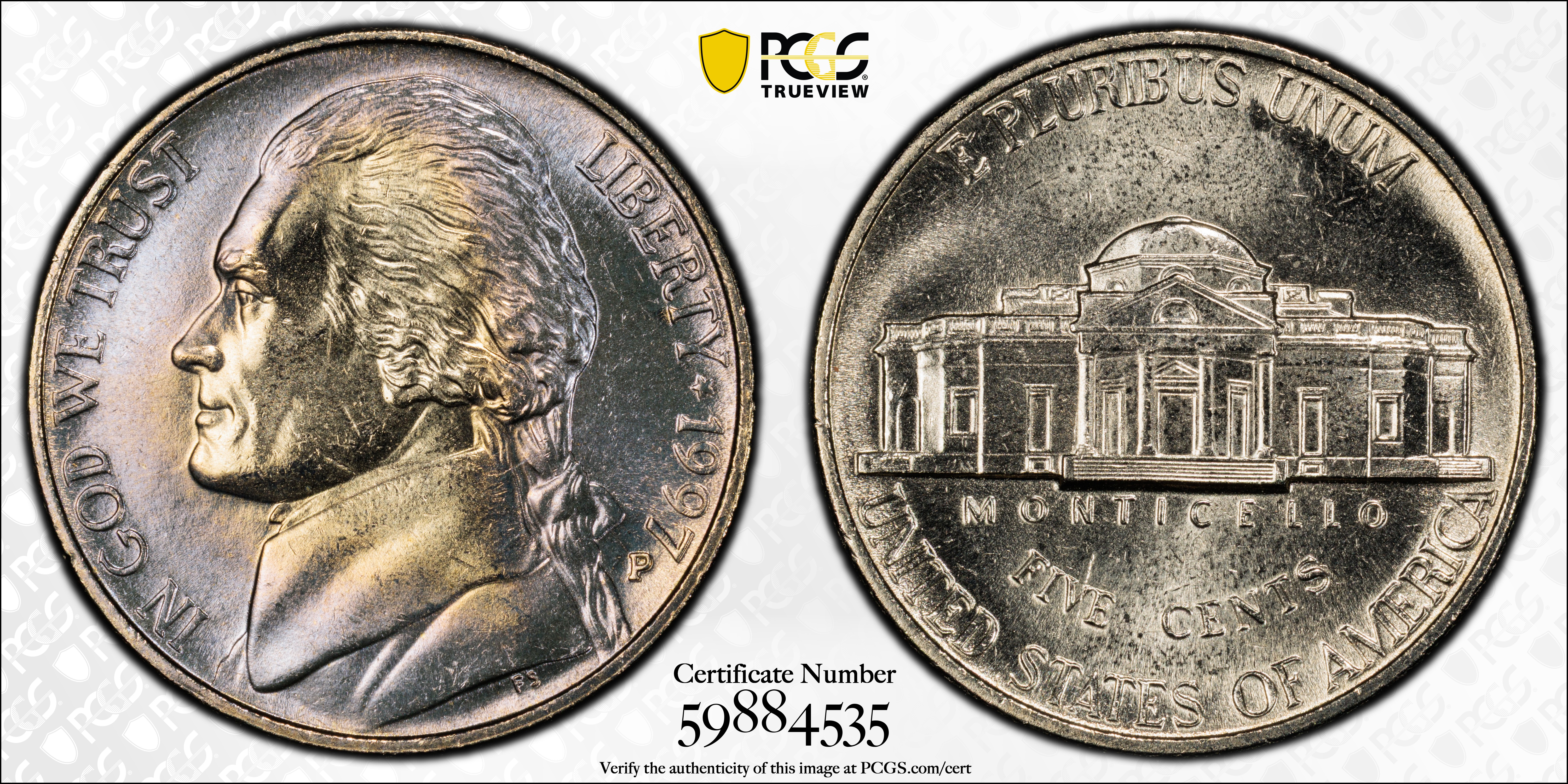 The 1997-P Jefferson Nickel is really common. Circulated examples can easily be pulled from circulation. In lower Uncirculated grades they are also common and can be obtained fairly easy. Only in MS66 condition and higher does it become scarce, especially with the Full Steps details. There are few examples known in MS67 Full Steps and even fewer in MS68 Full Steps but none are known in higher condition.