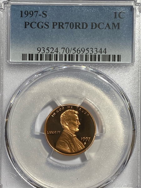 1997-S 1C, DCAM PR70DCAM Certification #56953344, PCGS #93524