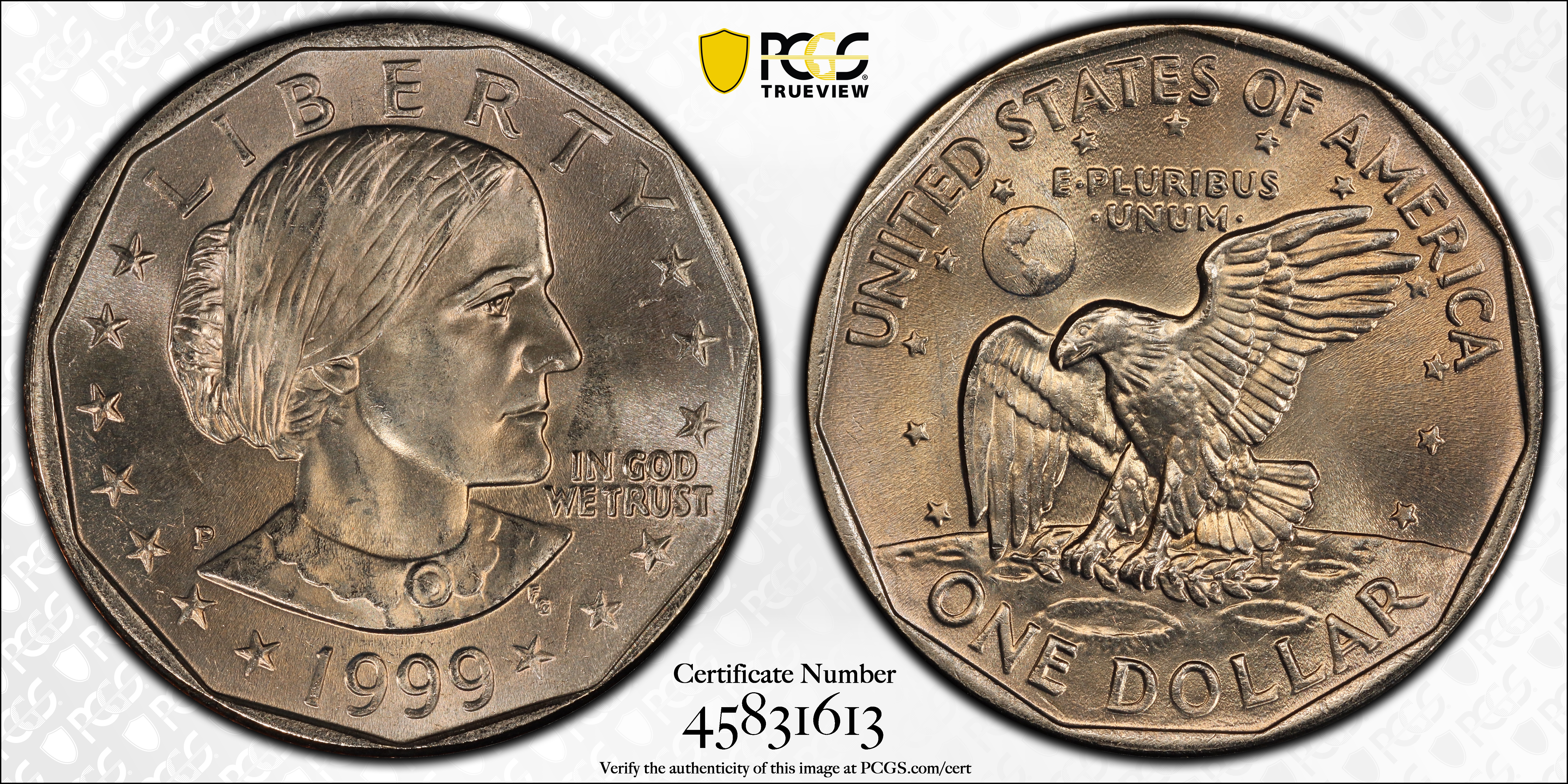 In 1999 the Mint struck over 29 million Susan B. Anthony Dollars at the Philadelphia Mint. In 1981 the Philadelphia Mint struck 3 million. Therefore, the 1999 Susan B. Anthony Dollar is very common and examples in Uncirculated grades are easily obtainable. Only in MS67 condition do they become somewhat scarce but they probably still exist in the thousands in this condition. In MS68 condition they are almost unheard of and less than a few dozen examples have been certified by PCGS with no coins being graded in higher condition.