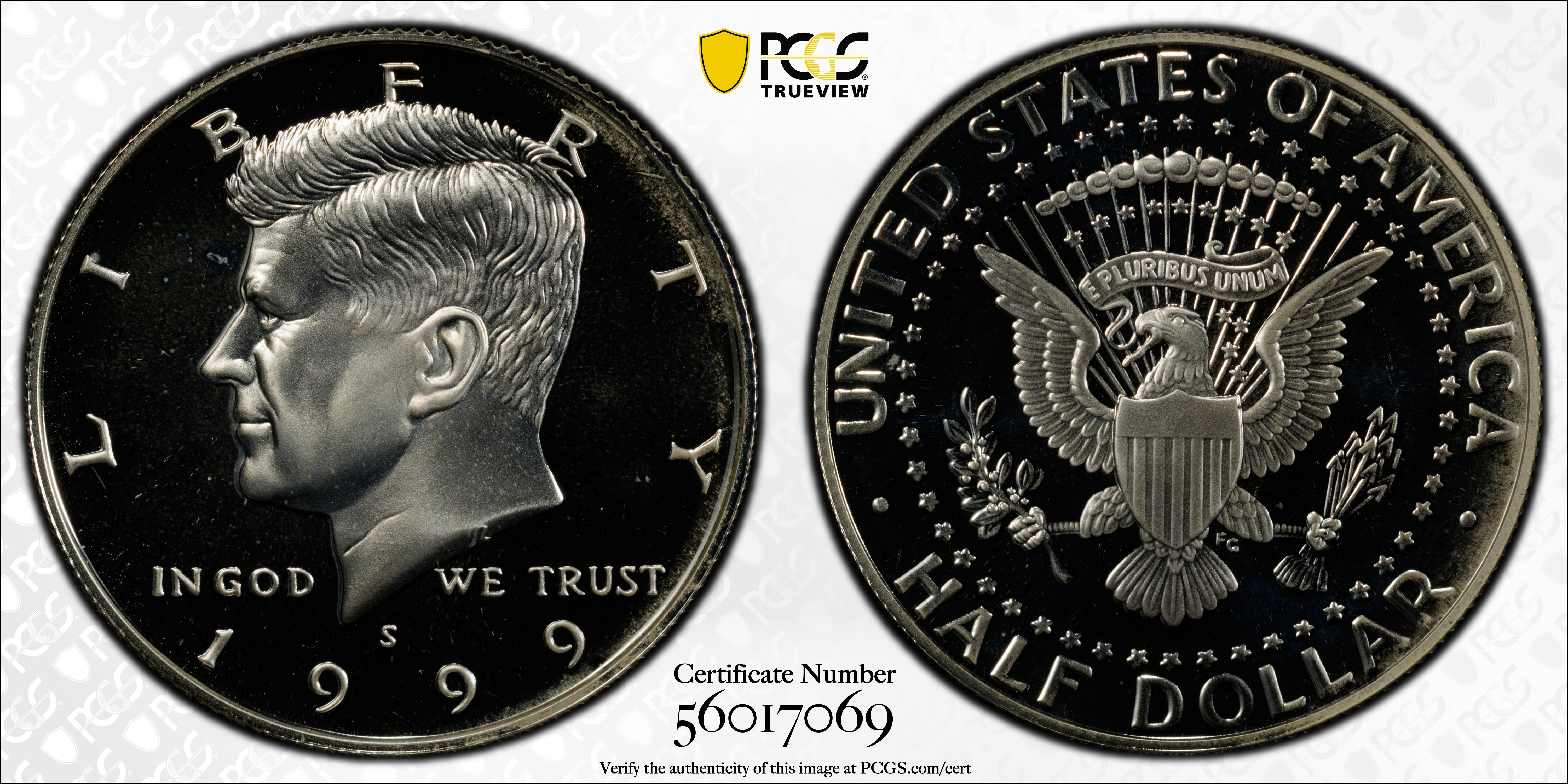 In 1999 the U.S. Mint struck clad and silver Proof Kennedy Half dollars. The 1999-S Proof Kennedy Silver Half Dollar is fairly easy to locate and sells for a small premium close to the spot price of silver. Examples up to PR69 Deep Cameo are easy to obtain. In perfect PR70 Deep Cameo they are considerably scarcer and worth a slightly higher premium.