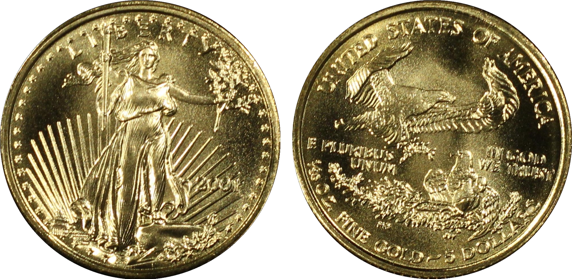 The $5 2001 Uncirculated Gold Eagle has one of the lower mintages in the series. However, the mintages are still high overall that most coins don't command a significant premium over gold spot prices. Only perfect graded MS70 coins tend to bring a significant premium.