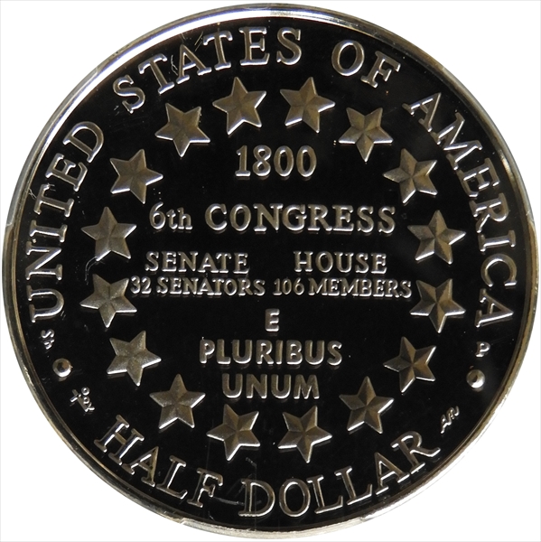Flawless black mirrors pops with this simply rendered commemorative designs with a very wordy reverse offering just a few top-grade proof specimens from PCGS. Interesting concept to show the outline of the current day capitol silhouetted behind the North Wing of the original capitol building two centuries earlier; still, a very plain "token-looking" commemorative with open broad flat surfaces in both the fields and devices making that perfect coin elusive. The shadowy future capitol obscures the horse and buggy in the foreground. The coin recalls the turn of the nineteenth century capitol, and the reverse features 16 stars arranged in a circle for the sixteen states in 1800. The wordy text records the 32 senators and 106 congressmen. This piece is quite flashy in hand with the heavily frosted devices and multiply reflective mirrors. Until 2024 only one Top-Pop perfect specimen had surfaced, when a few elusive companion pieces made an appearance.