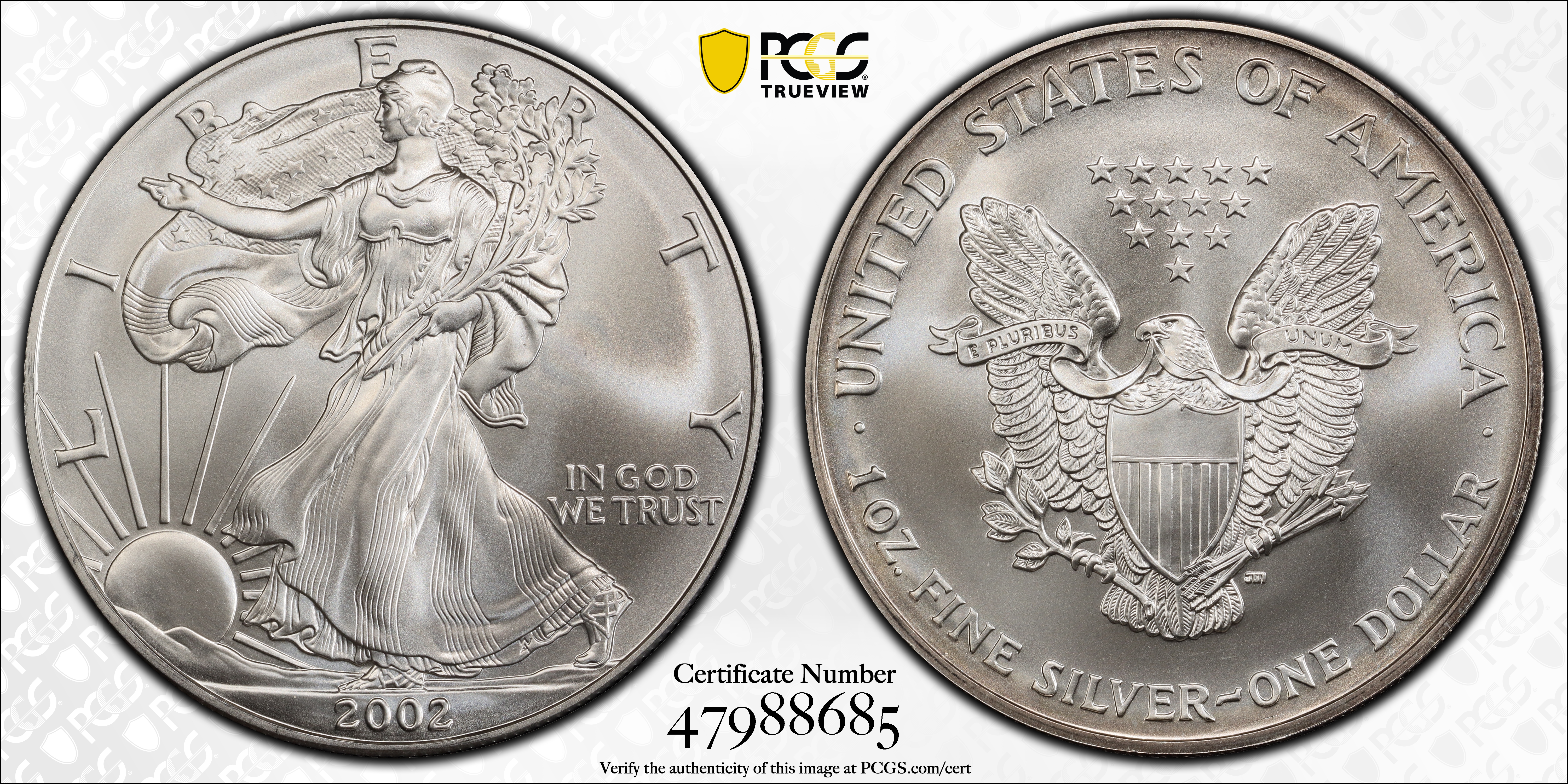 2002 $1 Silver Eagle MS69 Certification #47988685, PCGS #9959