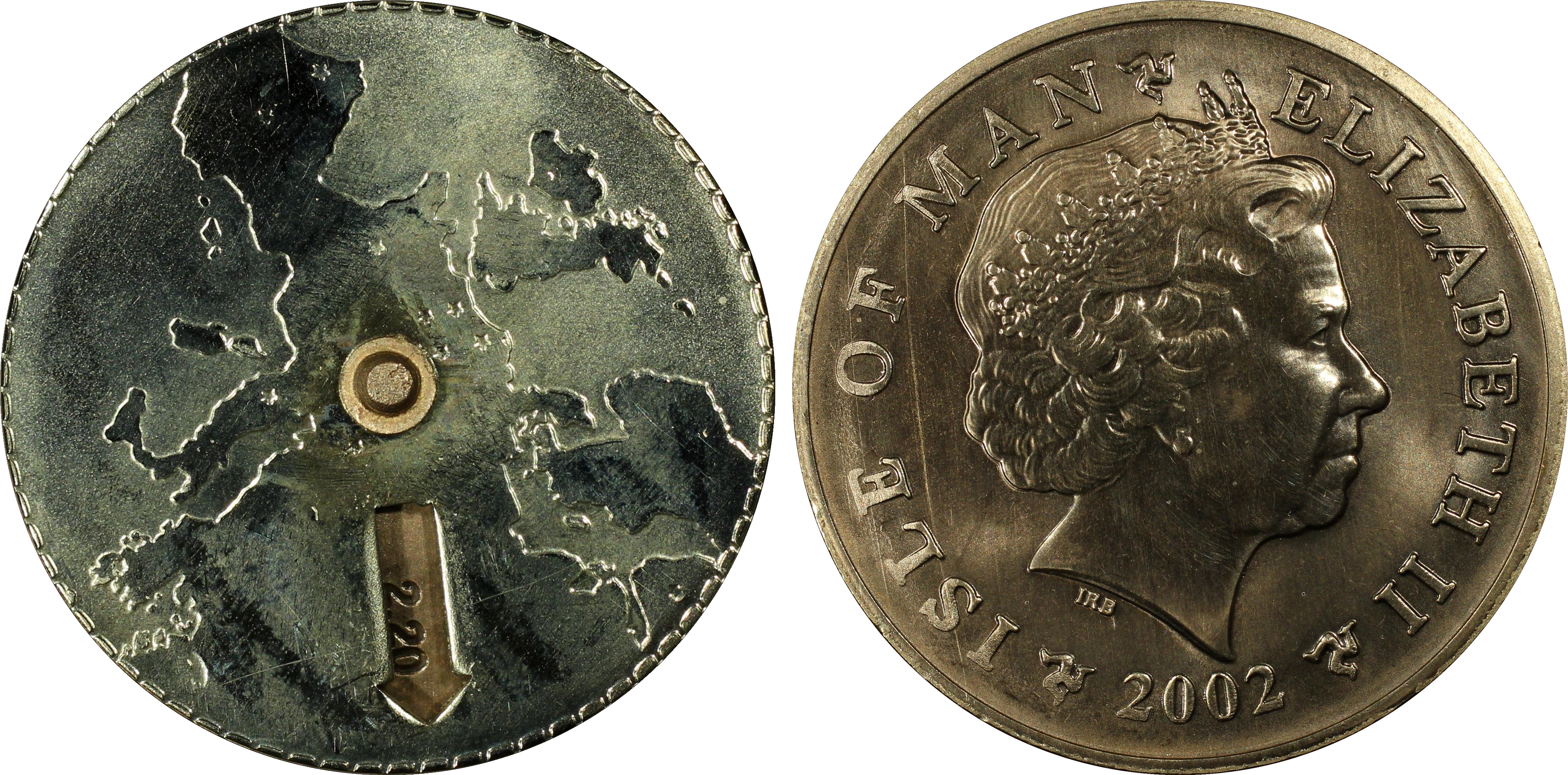 (KM# 1128) Uncirculated Mintage: 30,000 - Minted by the Pobjoy Mint as a momento of the Euro conversion. The Isle of Man determined to mark this historic occasion by means of a unique legal tender coin that features a money converter within the main body of the coin recessed to enable an independent central disc to spin with an arrow to show the foreign exchange rate in each nation on the very day of inauguration