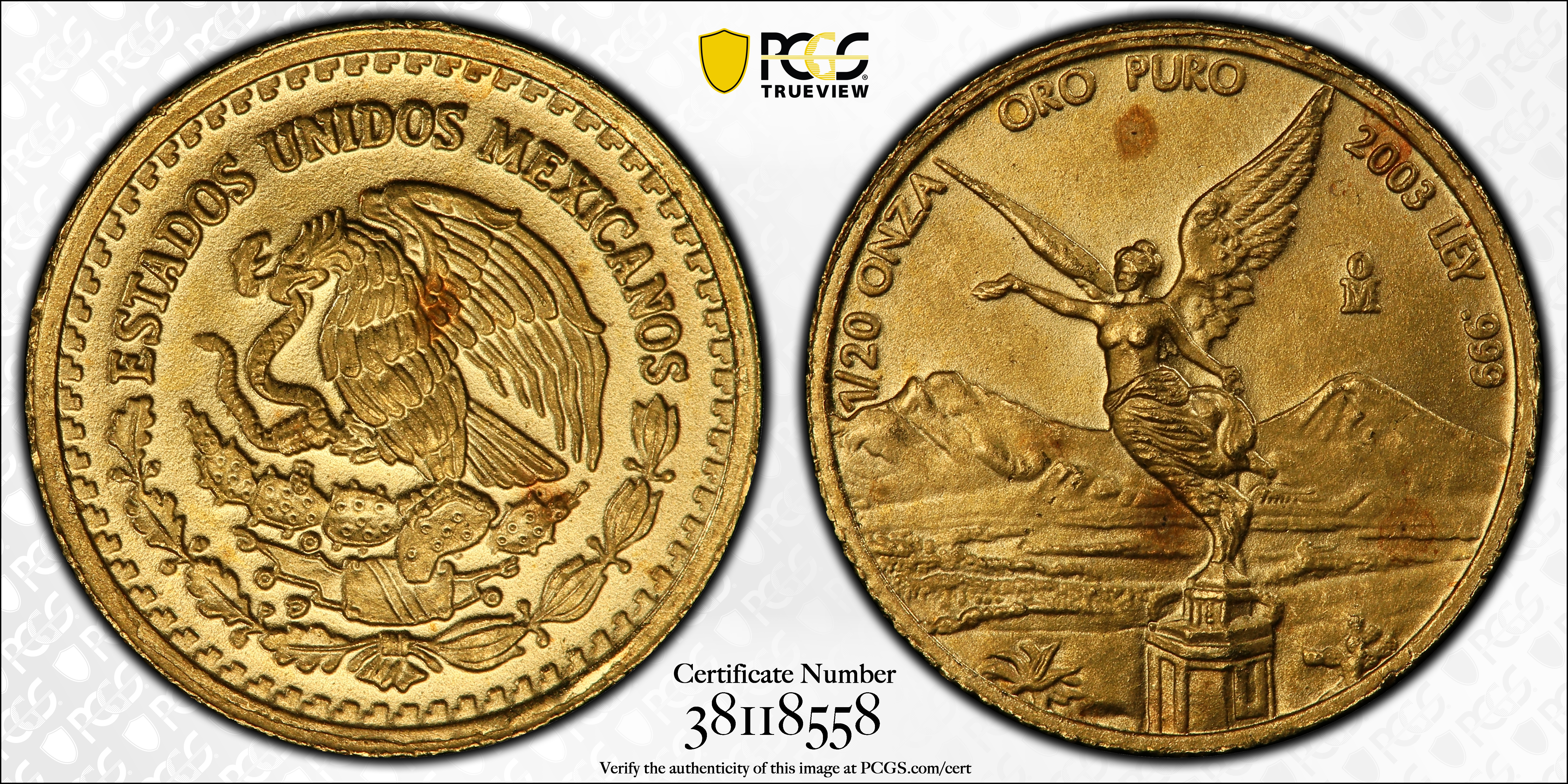2003-Mo 1/20 oz Libertad Au MS67 Certification #38118558, PCGS #256939