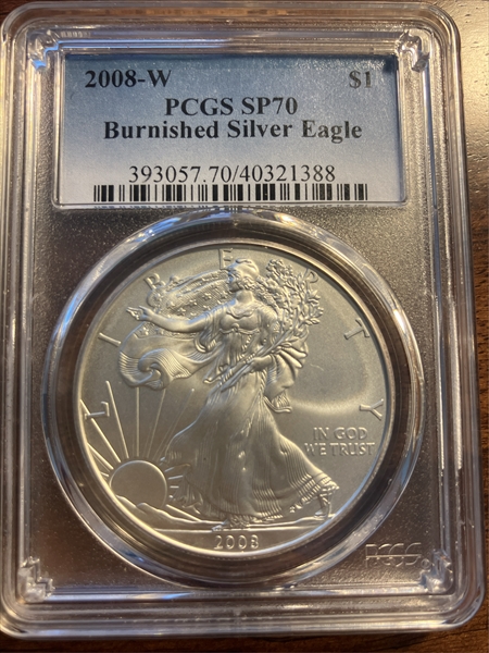 2008-W $1 Burnished Silver Eagle SP70 Certification #40321388, PCGS #393057