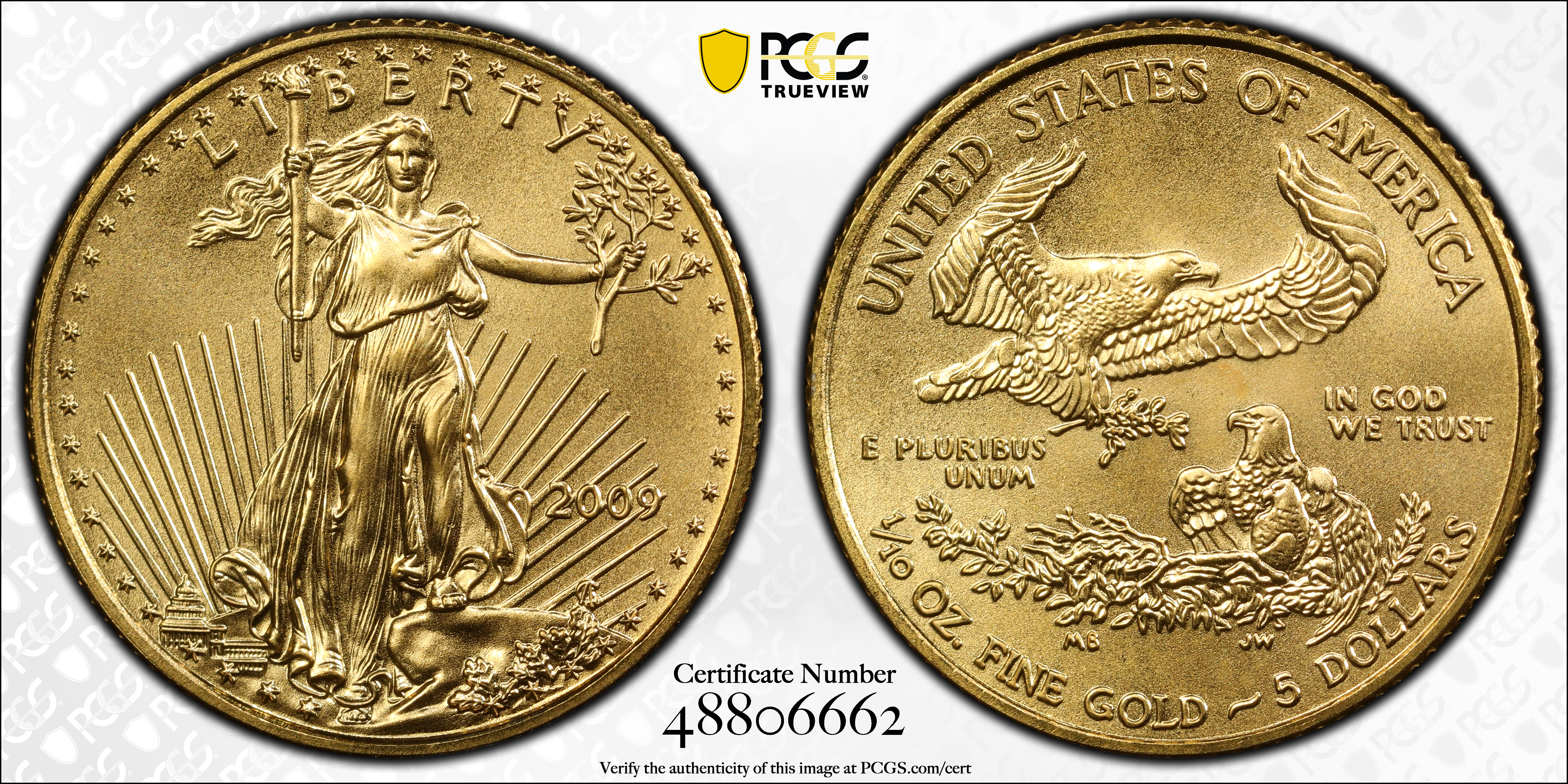 2009 $5 Gold Eagle MS70 Certification #48806662, PCGS #404429