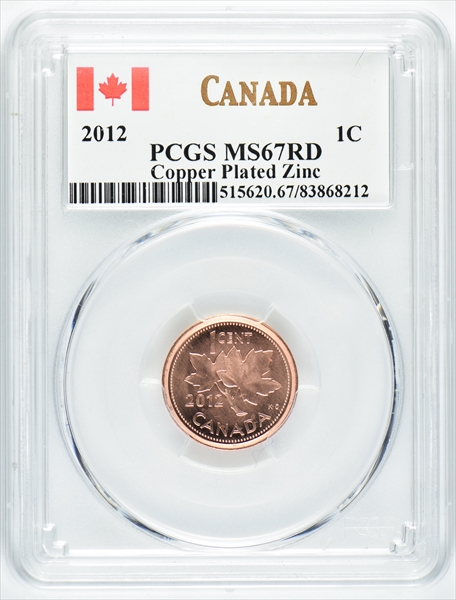 2012 1C Copper Plated Steel, RD MS67RD Certification #83879985, PCGS #512707