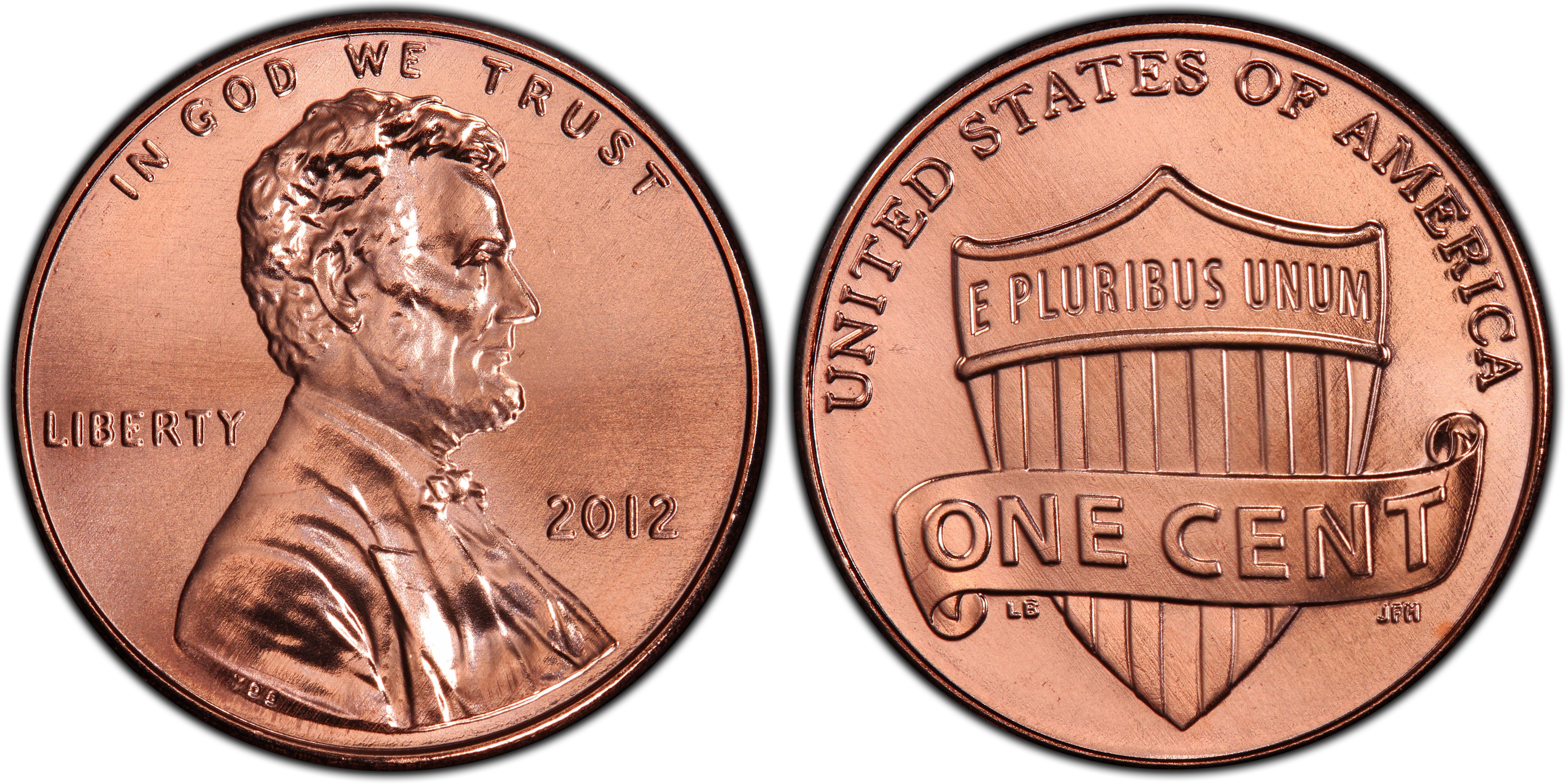 The 2012 Lincoln cents have a Union Shield design just as they did in the two previous years from 2010 and 2011. Coins are very common up to grades of MS65. In MS66 they become a bit scarce with some searching required. In MS67, they are very difficult to find with few examples available. In MS68, it is the ultimate grade with very few examples known in this condition with none being finer.