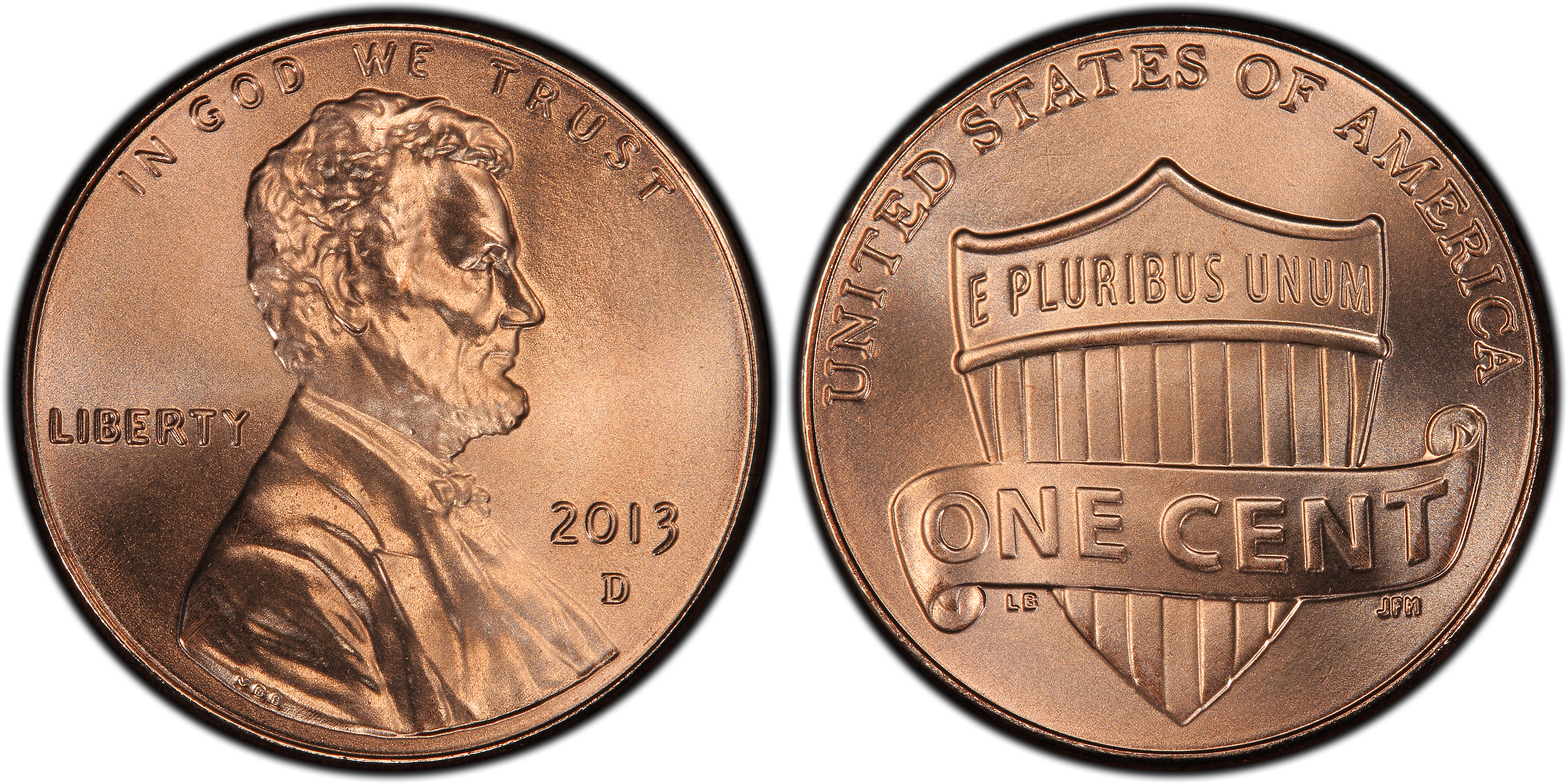 The 2013-D Shield Lincoln Cent is very common up to about MS66 condition, as the U.S. Mint struck over 3 billion examples for circulation. In MS67 grade t is a little harder to find but enough examples exist that just about any serious collector can obtain one easily. In MS68 condition they are scarce and collectors will probably have to search through thousands if not tens of thousands of examples from rolls to be able to find one.