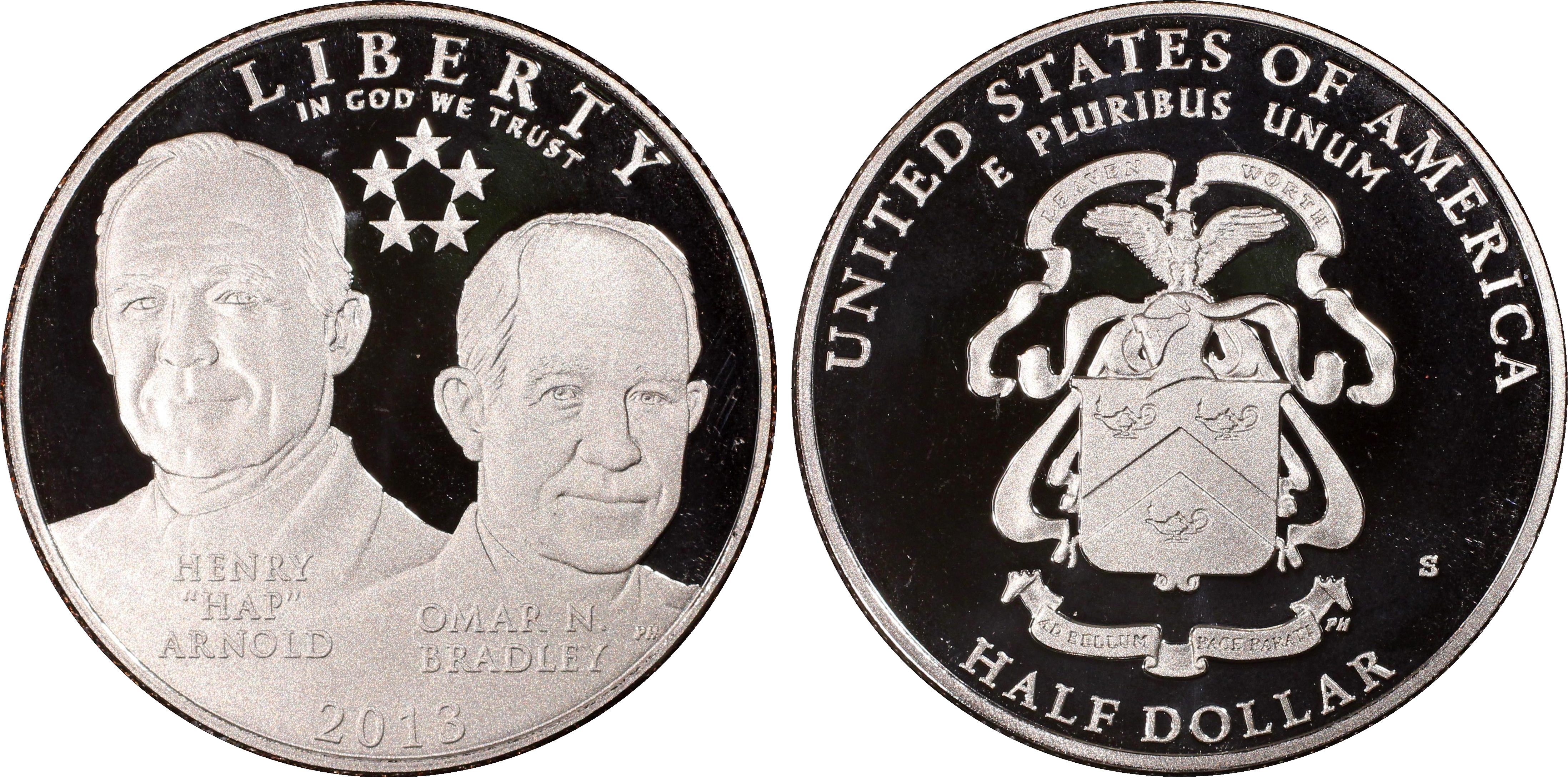 The 2013-S Proof 5 Star Generals Commemorative Arnold, Bradley Half Dollar was struck to commemorate the 132nd anniversary of the United States Army Command and General Staff College (CGSC) which was established in 1881.