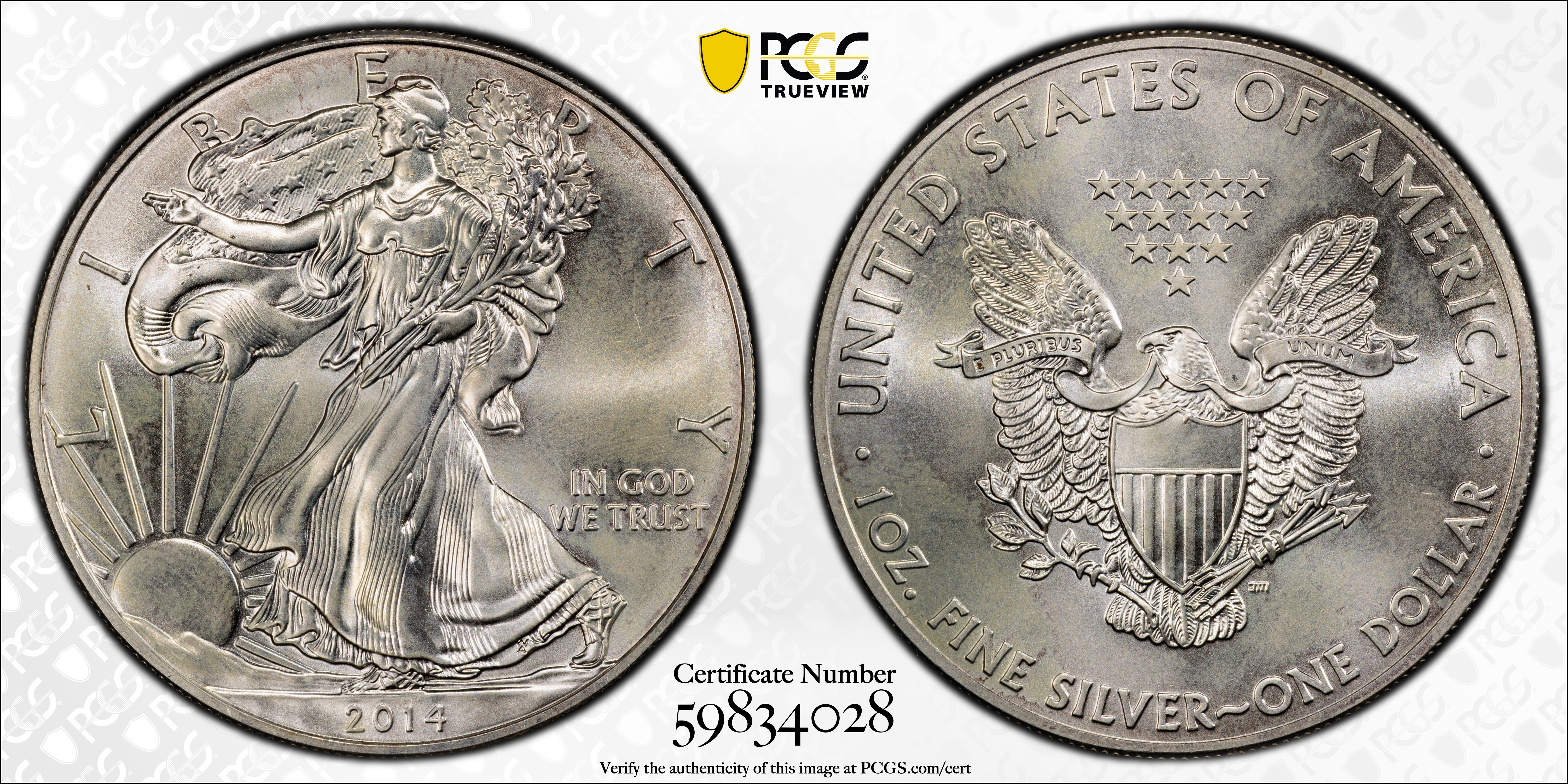 2014 $1 Silver Eagle MS65 Certification #59834028, PCGS #521459