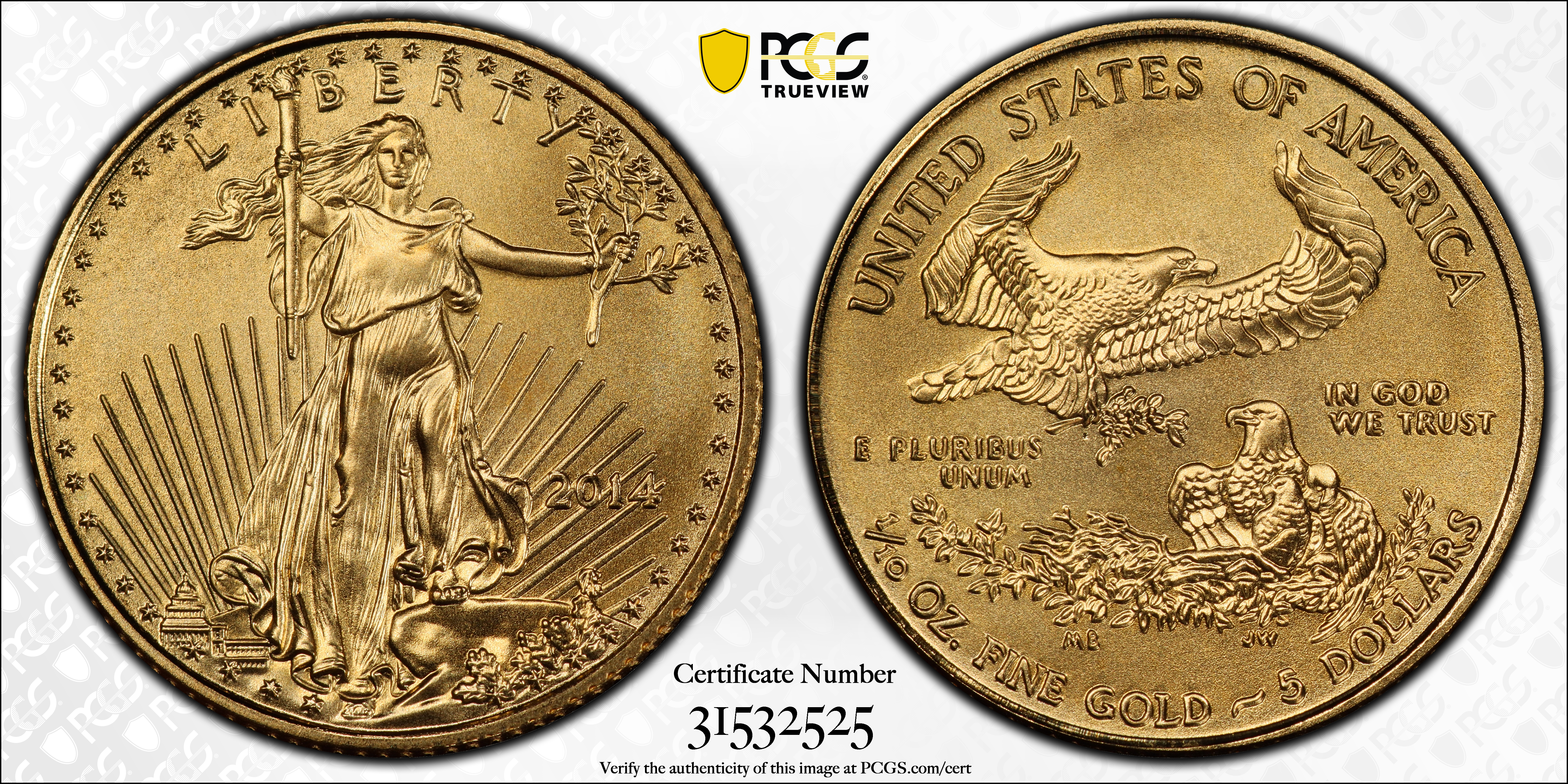 2014 $5 Gold Eagle MS70 Certification #31532525, PCGS #521914