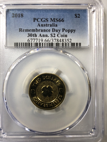 2018 $2 Remembrance Day Poppy 30th Ann. $2 Coin MS66 Certification #37848352, PCGS #677719