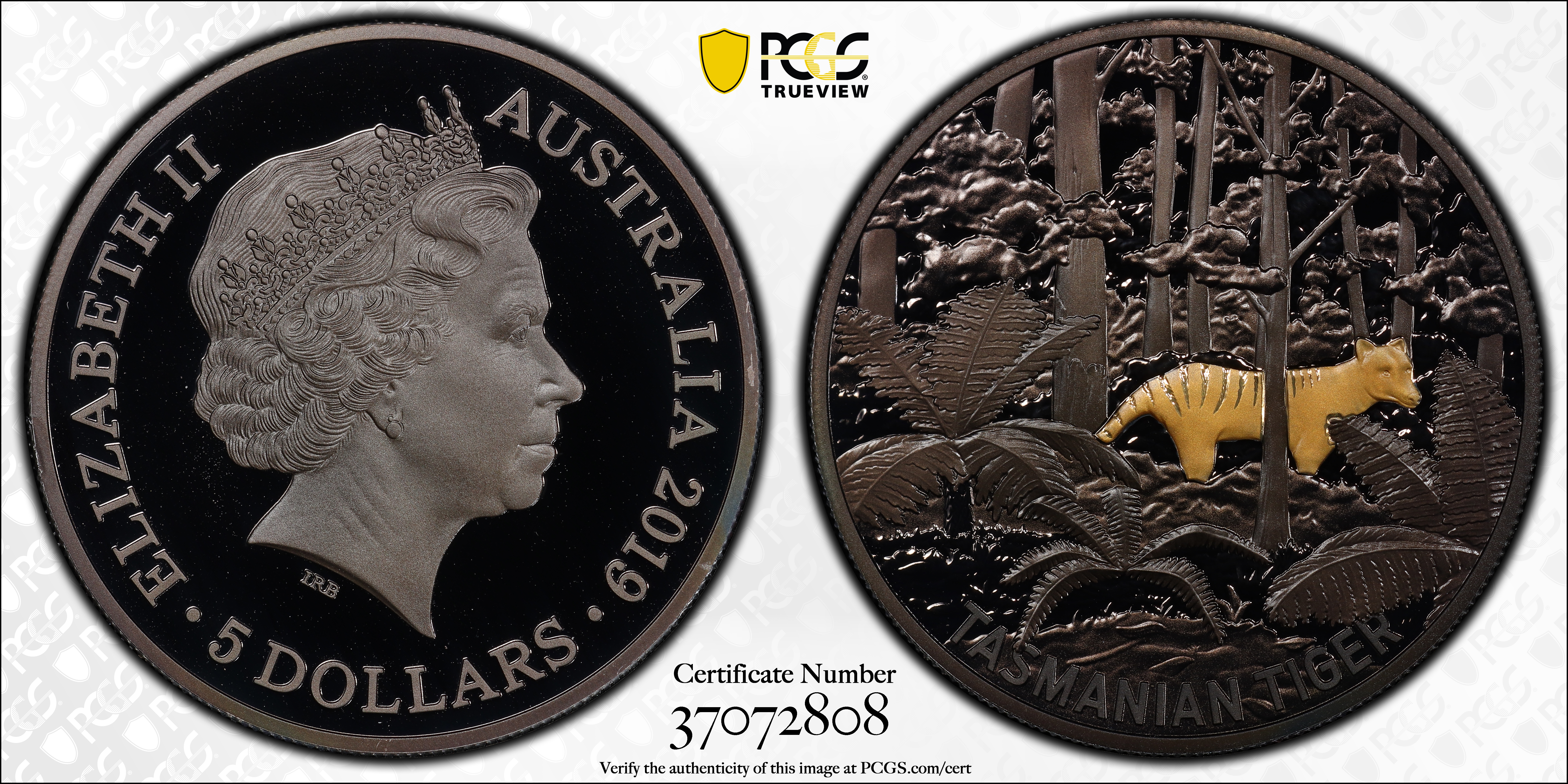 2019 $5 Tasmanian Tiger Echoes of Australian Fauna, DCAM PR70DCAM Certification #37072808, PCGS #718017