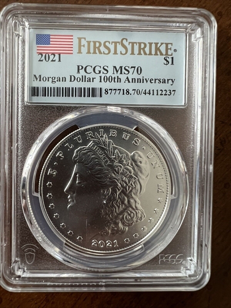 2021 $1 Morgan Dollar 100th Anniversary First Strike MS70 Certification #44112237, PCGS #877718